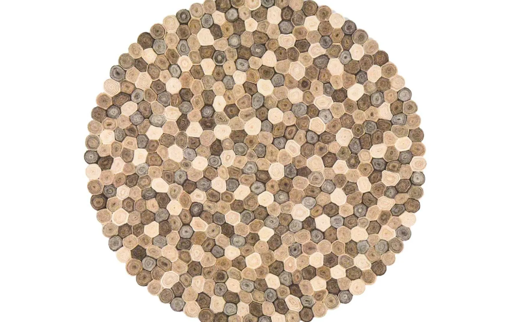 Unser Webteppich aus kleinen Baumscheiben im Patchwork-Look ist eine faszinierende Kreation, die aus einer Mischug aus Wolle und Polyester gefertigte ist. Jede Baumscheibe wurde sorgfältig in ein kunstvolles Patchwork-Muster eingewebt, um einen Teppich von einzigartiger Schönheit und rustikalem Charme zu schaffen. Die Kombination aus natürlicher Wolle und strapazierfähigen Polyester verleiht dem Teppich nicht nur eine warme und gemütliche Textur, sondern sorgt auch für Langlebigkeit und Pflegeleichtigkeit.