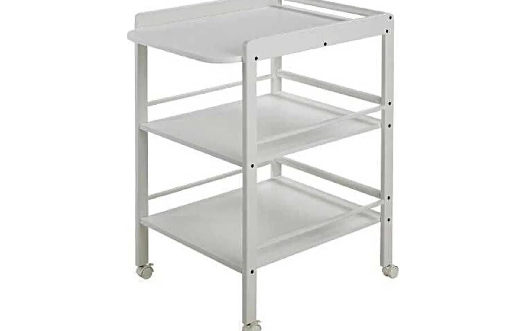 Dieses Wickelregal überzeugt mit großzügigen Ablageflächen und praktischen Rollen. Es punktet ebenso mit Mobilität: Vier mit Bremsen ausgestattete Teppichrollen ermöglichen es, das Möbelstück flexibel von einem Raum in den anderen zu schieben. Dank der großen Ablageflächen sind sämtliche Utensilien, die zum Windelwechseln benötigt werden, immer dabei. Das aus massiver Buche und Spanplatten gefertigte Regal ist bis zu elf Kilogramm belastbar. Das Wickelbrett befindet sich in einer Höhe von 86 Zentimetern. So gestaltet sich die Babypflege besonders rückenfreundlich.