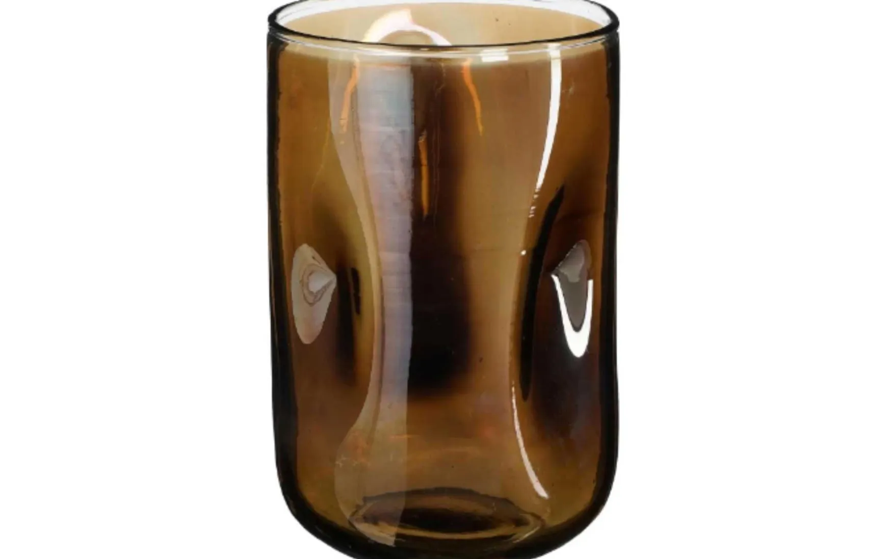 Dieses windlicht ist wirklich wunderschön. Das Glas hat einen Delleneffekt und ist braun mit glänzender Oberfläche. In das Glas passen ein Teelicht und eine Stumpenkerze. Durch das Kerzenlicht entsteht ein Lichtspiel – stimmungsvoll! Die Maße betragen H20 x Ø14 cm.