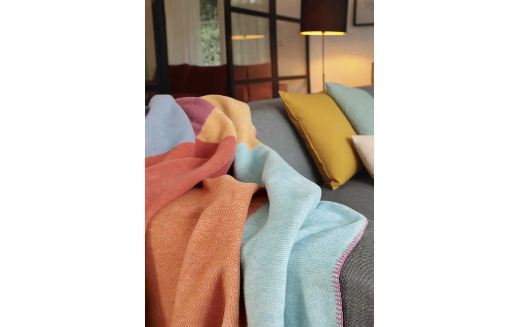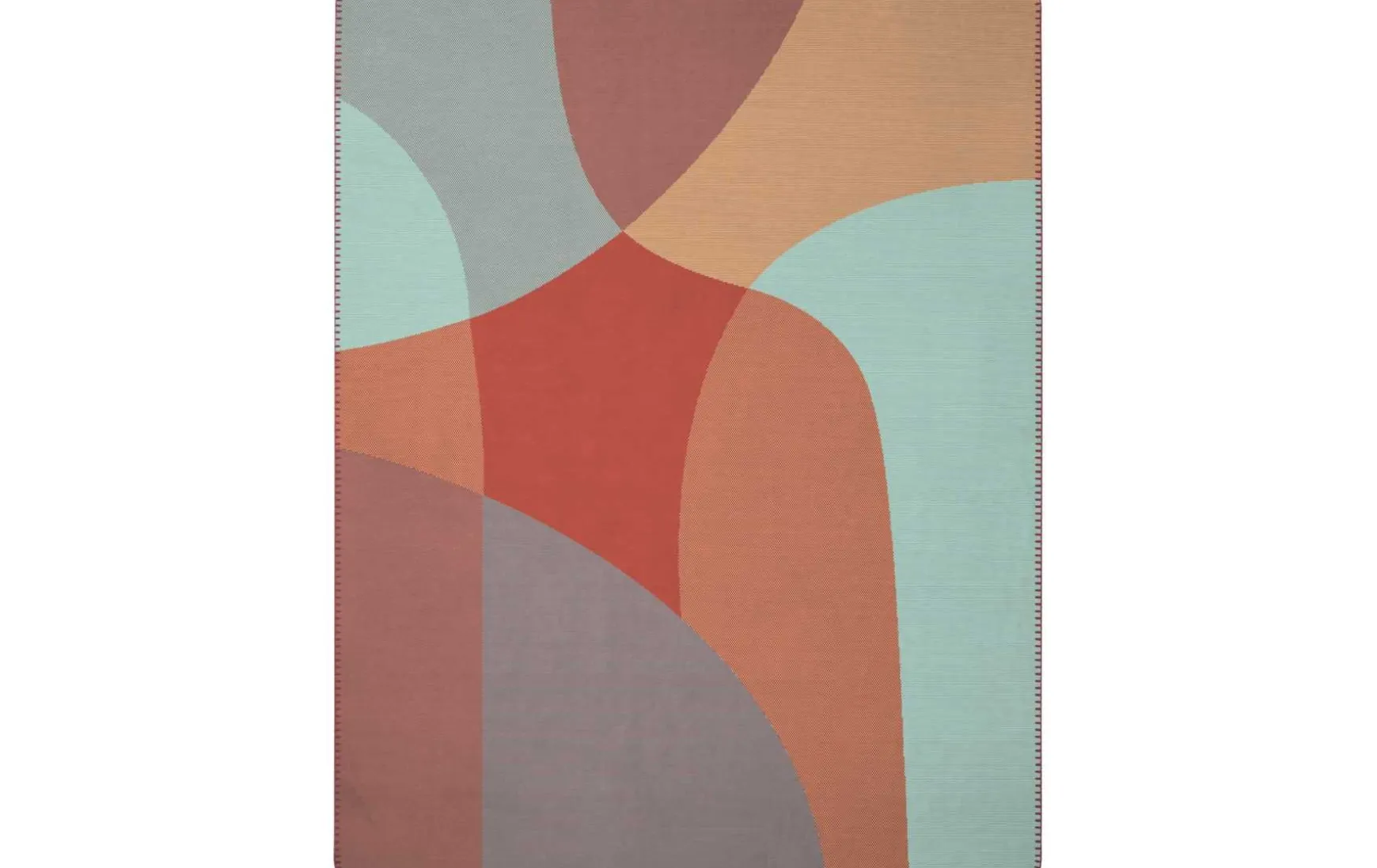 Dazu passt diese markante Wohndecke mit ihren großen, geschwungenen Farbflächen in Nuancen von Orange, Lila und Türkis.