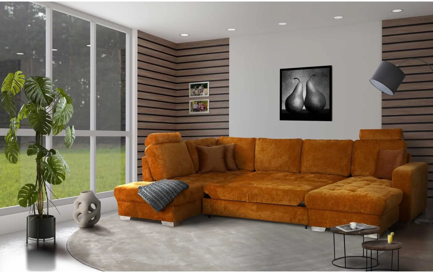 Verwandeln Sie Ihr Wohnzimmer in eine Wohlfühloase mit dieser modernen U-förmigen Wohnlandschaft in strahlendem Curry-Orange. Mit großzügigen Maßen von ca. 341 cm Breite, Schenkeln von ca. 215 cm links und ca. 165 cm rechts sowie einer komfortablen Liegefläche von ca. 128 x 265 cm bietet sie reichlich Platz zum Entspannen. Die weichen Polster auf hochwertigem Stoffbezug und die echten Rückenlehnen garantieren erstklassigen Sitzkomfort, während die eleganten chromfarbenen Metallfüße dem Raum einen modernen Touch verleihen. Inklusive dekorativer Zierkissen, optional erweiterbar mit Kopfstützen oder Bettfunktion, lässt sich die Wohnlandschaft individuell an Ihre Bedürfnisse anpassen. Außerdem ist sie in verschiedenen Farbvarianten erhältlich – perfekt für jedes Wohnambiente.