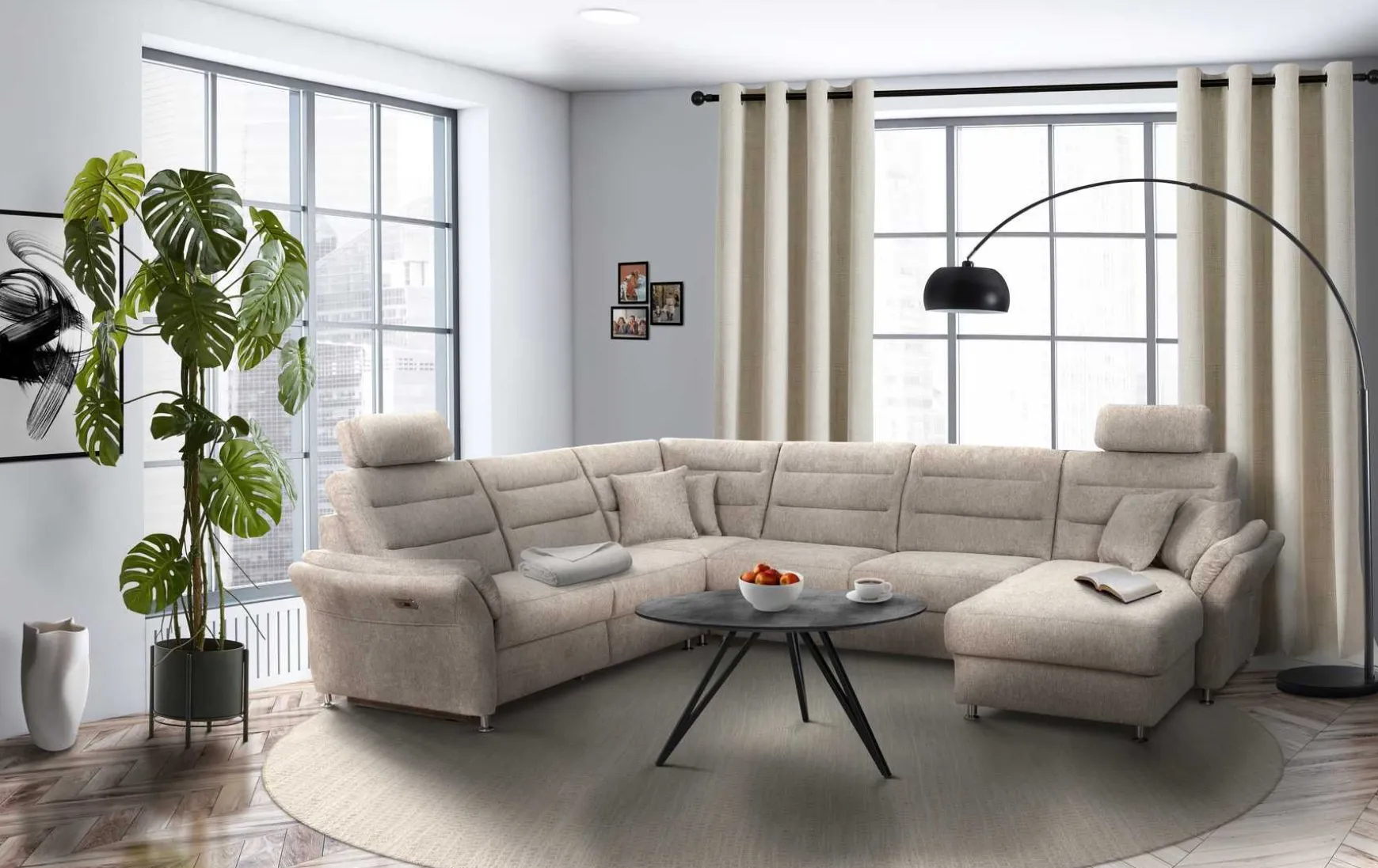 Diese moderne Wohnlandschaft in U-Form überzeugt durch großzügige Abmessungen, hohen Sitzkomfort und flexible Gestaltungsmöglichkeiten. Mit einer Breite von ca. 350 cm bietet sie reichlich Platz für Familie und Gäste. Der hochwertige Stoffbezug in Beige wird durch eine elegante hellbeige Ziernaht stilvoll ergänzt. Dank „Rücken echt“ ist die Wohnlandschaft frei im Raum platzierbar. Die Sitzpolsterung aus komfortablem Kaltschaum sorgt für ein angenehmes Sitzgefühl, während die beliebig einsteckbaren Kopfstützen zusätzlichen Komfort bieten. Individuell konfigurierbar und in weiteren Farbvarianten erhältlich, lässt sich die Wohnlandschaft optimal an persönliche Wohnwünsche anpassen. Optionale Extras wie elektrische Relaxfunktion oder zusätzliche Kopfstützen sind gegen Mehrpreis erhältlich.