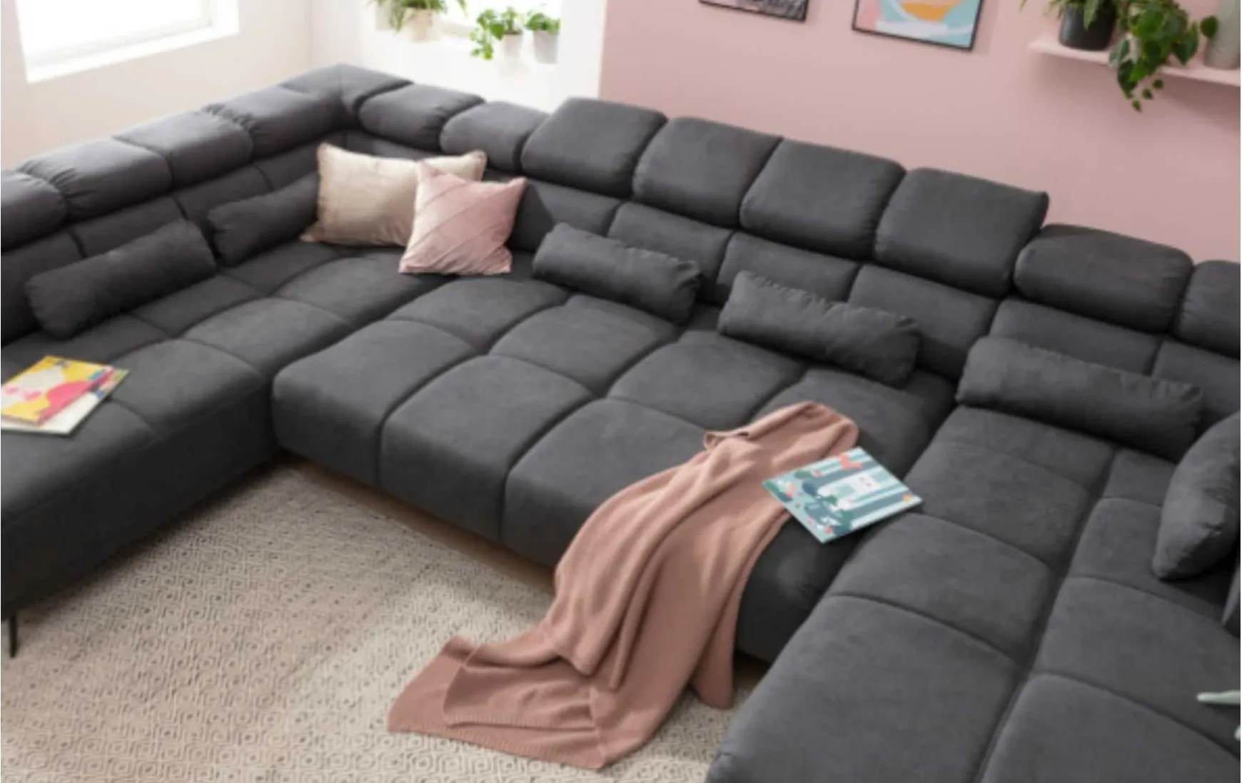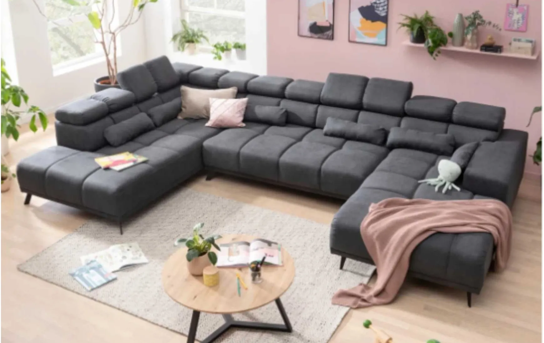 Auf dieser Wohnlandschaft wird das Sitzen zum Vergnügen. Eine Nosagunterfederung sowie ein Bonellfederkern sorgen für ein angenehmes, bequemes Sitzempfinden. Durch die komfortable Sitztiefenverstellung lässt sich das Sofa auch zum Schlafen nutzen. Eine weitere Zusatzfunktion, die das Sofa mitbringt, ist eine Kopfteilverstellung an allen drei Kopfteilen