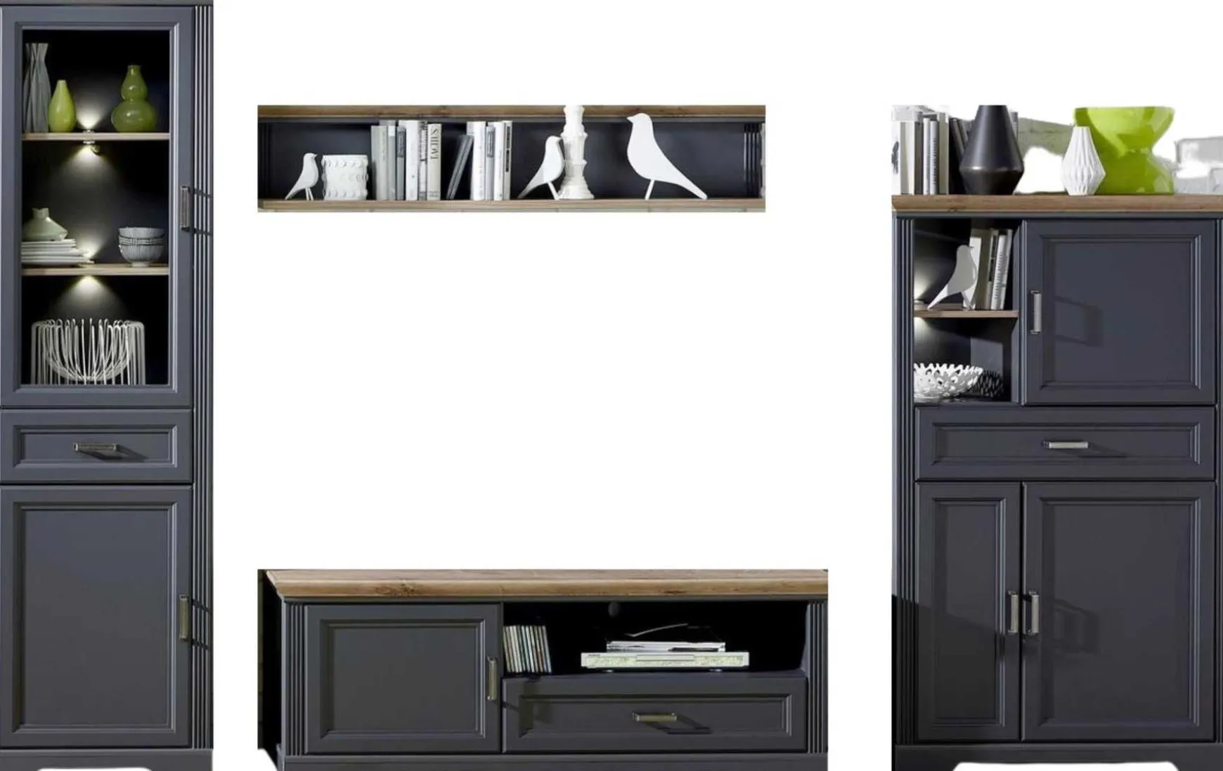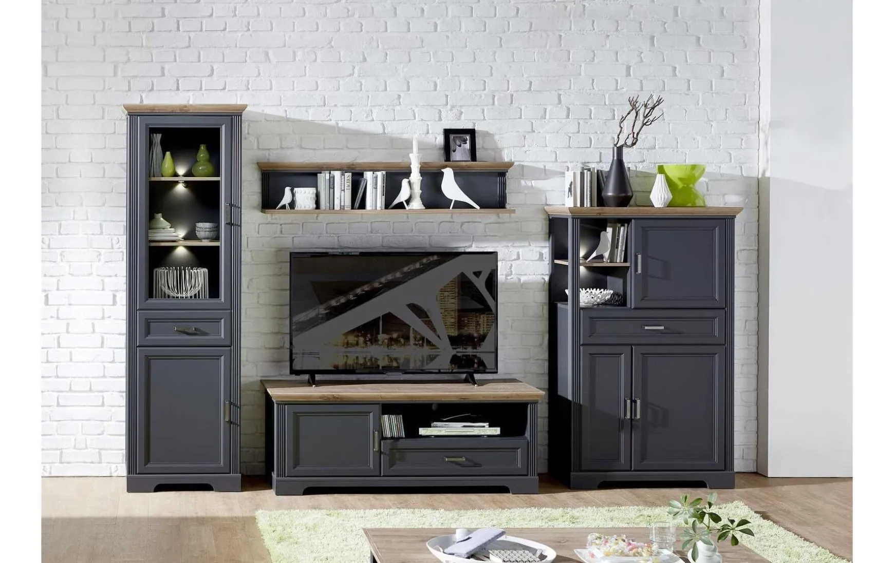 Diese stilvolle Wohnwand im Landhausstil verbindet modernes Graphit mit warmen Akzenten in Artisan Eiche Nachbildung. Die hochwertige Verarbeitung, dekorative Metallgriffe und die integrierte LED-Beleuchtung sorgen für eine wohnliche Atmosphäre mit eleganter Ausstrahlung. Dank der durchdachten Aufteilung aus Vitrine, Stauraumelement, TV-Unterteil und Wandboard bietet die Wohnwand viel Platz für Medien, Deko und Alltagsgegenstände.