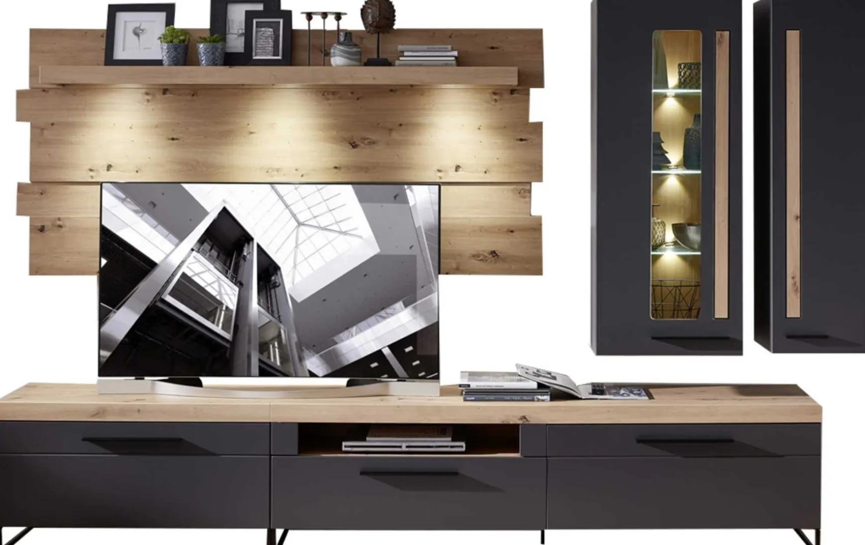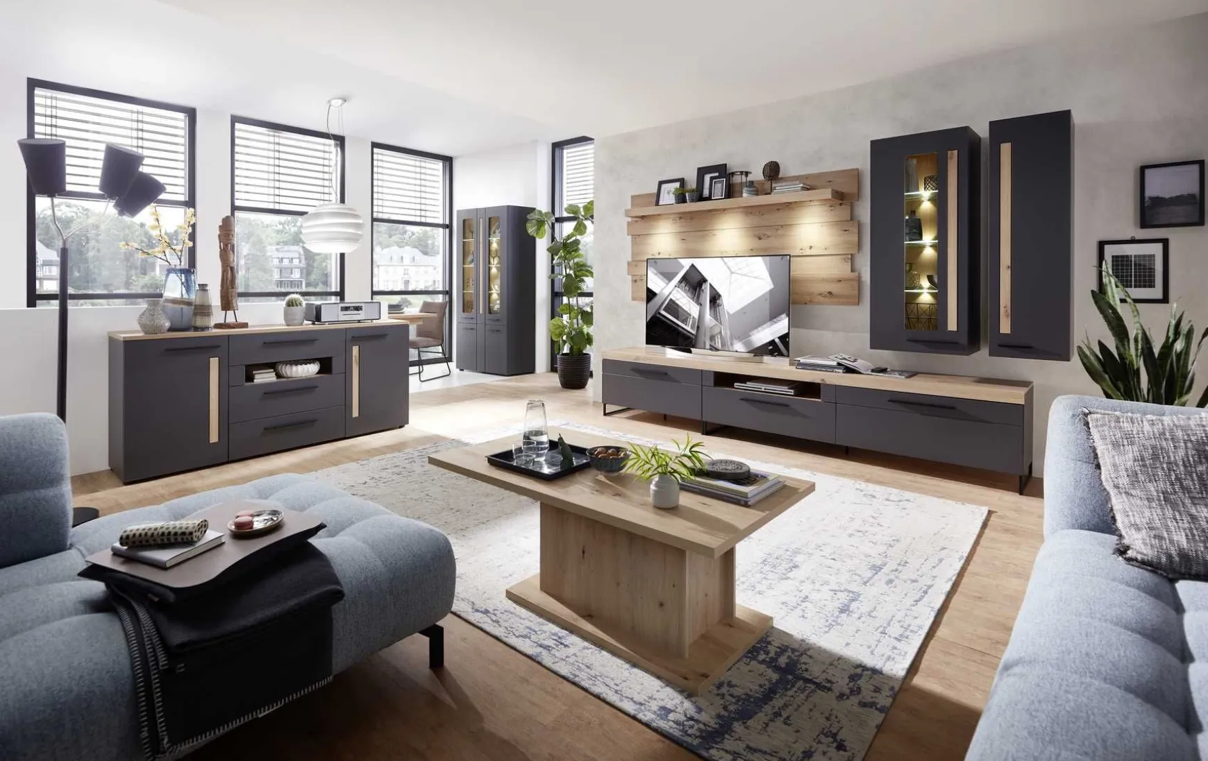 Gestaltet in Graphit mit Artisan Eiche Dekor, erhalten Sie eine schöne Wohnwand, die Ihnen jede Menge Stauraum als auch Dekorationsfläche bietet.