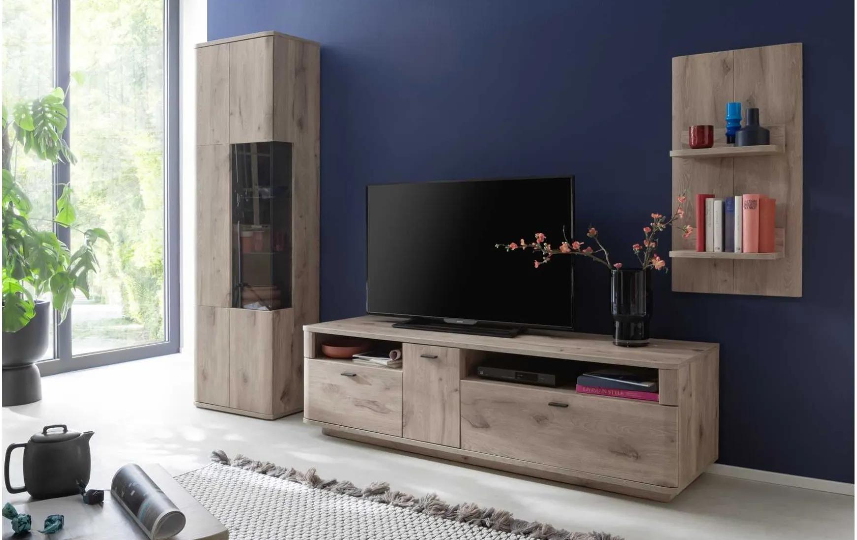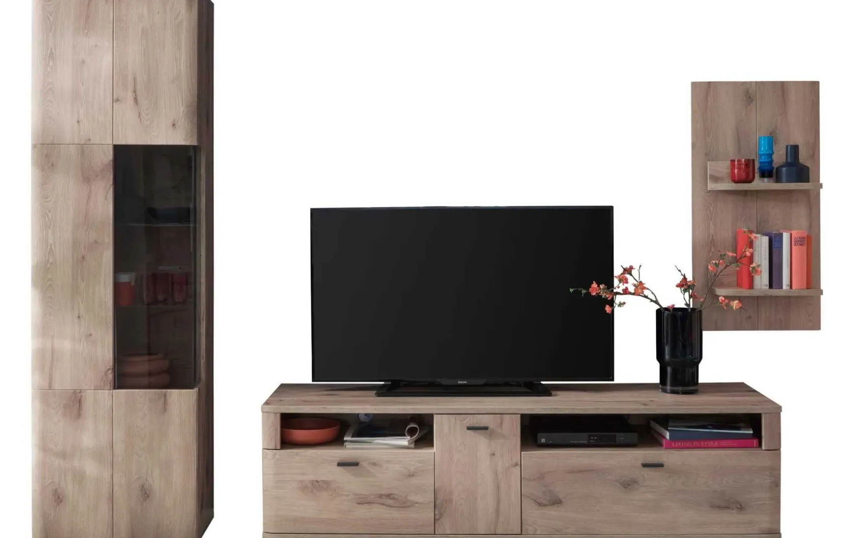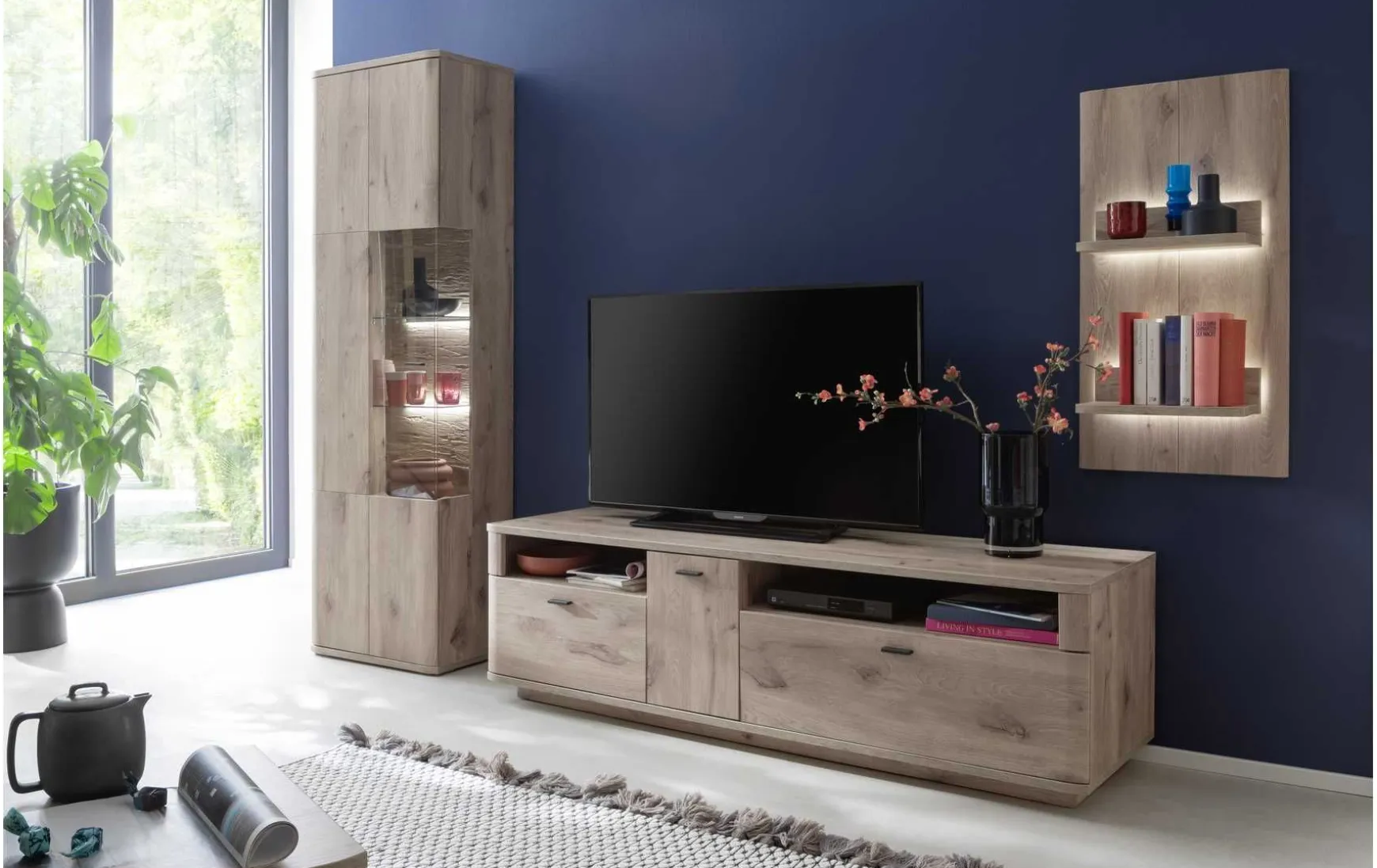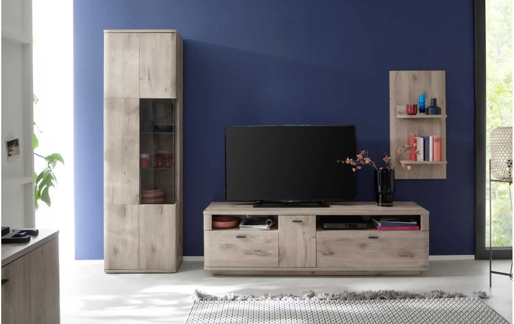 Diese hochwertige Wohnwand im Viking-Oak-Dekor überzeugt durch ihr harmonisches Gesamtbild und viel Stauraum für den modernen Wohnbereich. Die Fronten und der Korpus in Viking Oak Melamin-Nachbildung werden durch eine sichtbare 3D-Rückwand in sandgestrahlter Viking Oak Optik stilvoll ergänzt. Parsolgraues Glas an Front und Seiten sowie Klarglasböden unterstreichen die elegante Ausstrahlung. Das Set besteht aus Vitrine, TV-Unterteil und Wandregal und wird inklusive LED-Beleuchtung mit Funkfernbedienung geliefert – für ein stimmungsvolles Ambiente und eine moderne Präsentation Ihrer Wohnaccessoires.