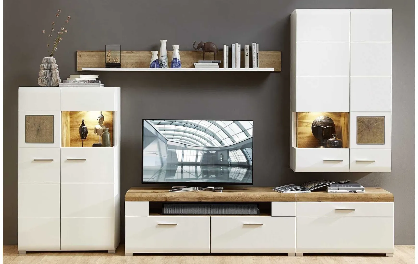 Diese hochwertige Wohnwand der Marke Trend Factory überzeugt mit modernem Konsum-Stil und einer eleganten Kombination aus weiß matt lackierten Fronten und stilvollem Hirnholz-Dekor. Mit einer Breite von ca. 320 cm bietet sie großzügigen Stauraum und klare Strukturen für ein aufgeräumtes Wohnambiente. Insgesamt sorgen vier Türen, zwei Schubladen und 16 offene Fächer für vielseitige Aufbewahrungs- und Präsentationsmöglichkeiten. Die integrierte LED-Beleuchtung setzt dekorative Akzente und unterstreicht die moderne Optik. Chromfarbene Griffe, Soft-Close-Schubkästen sowie Türdämpfung runden den hochwertigen Komfort ab. Passende Beimöbel wie ein Sideboard sind separat erhältlich und ermöglichen eine individuelle Wohnraumgestaltung.