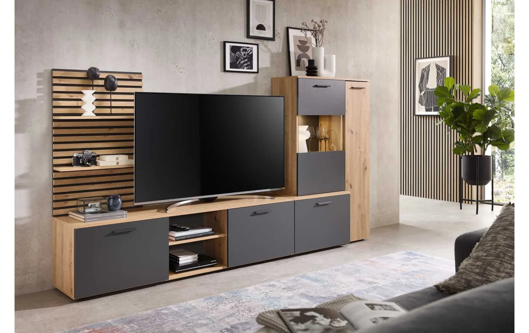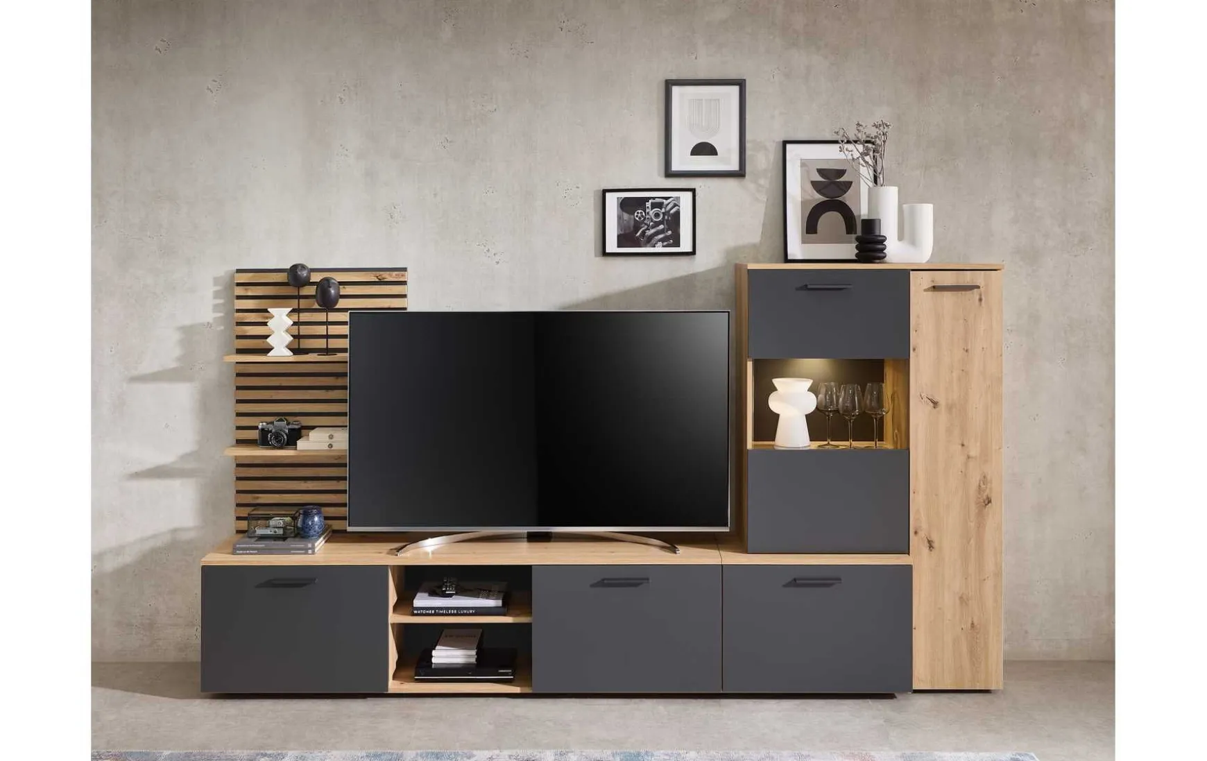 - Viel Stauraum durch Vitrine, Wandboard und Lowboard
