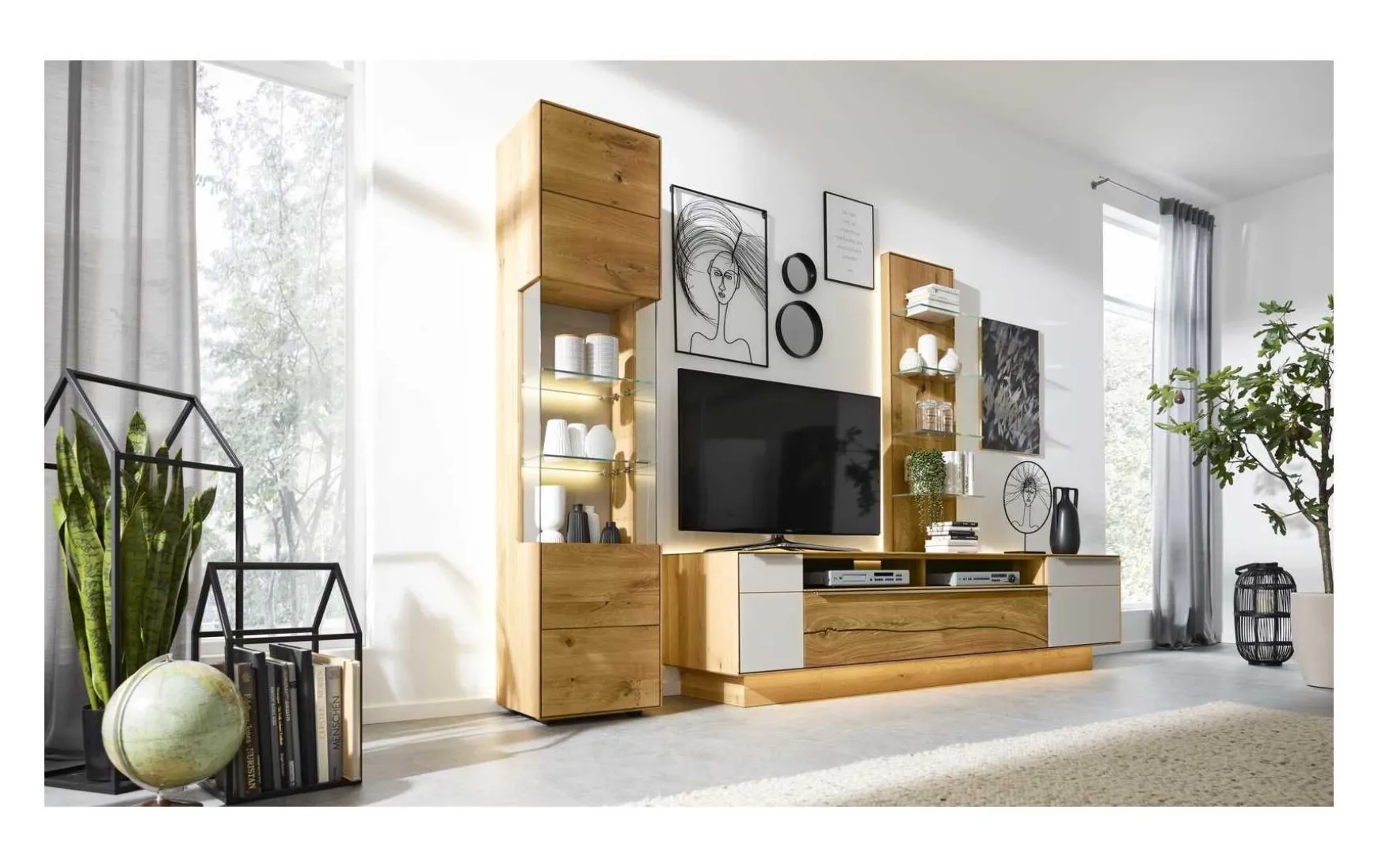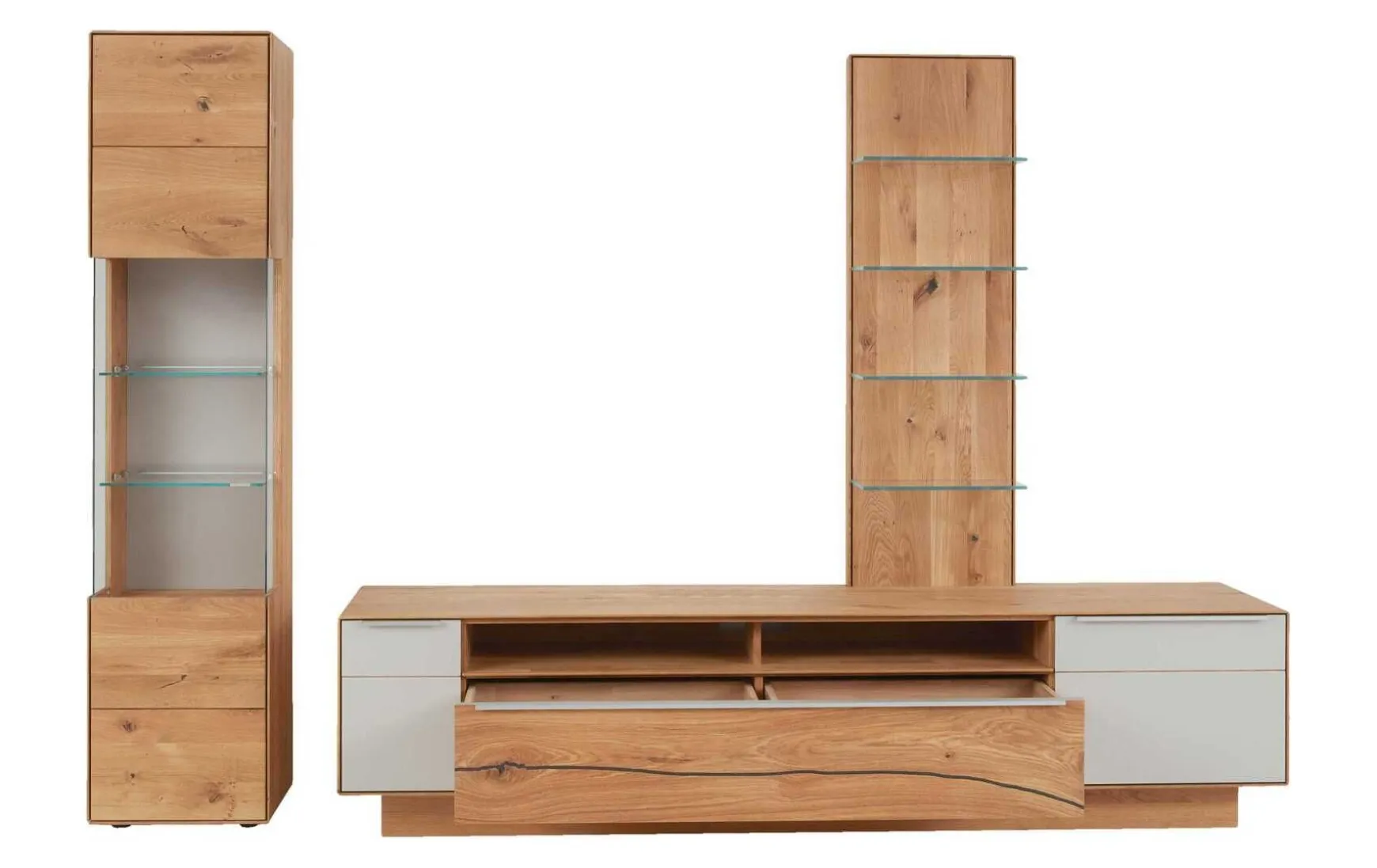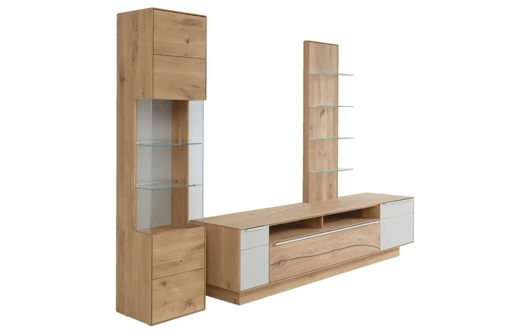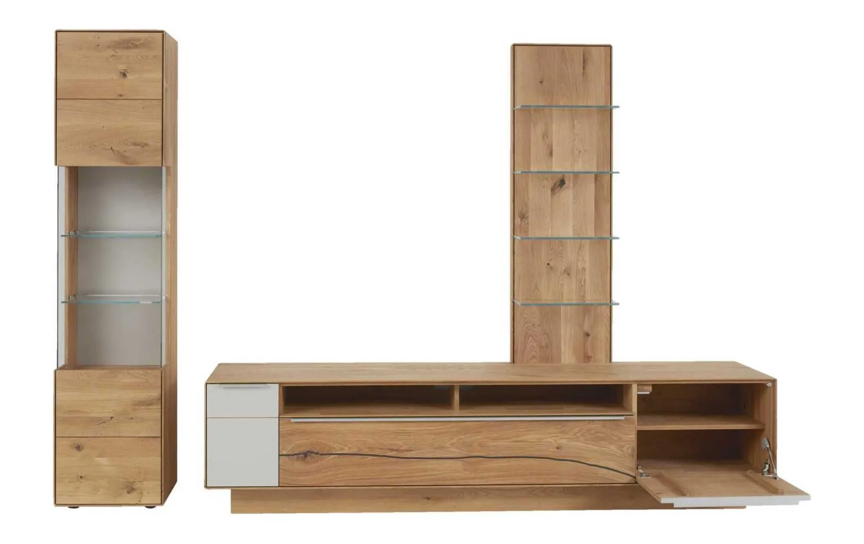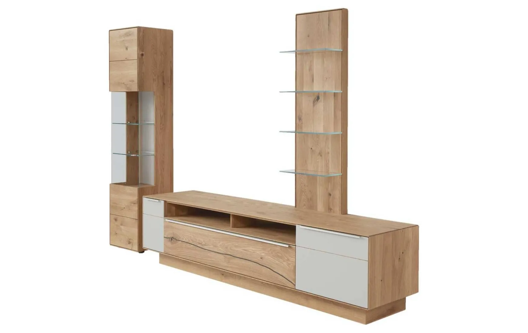 Diese Interliving Wohnwand präsentiert sich enorm funktionsstark und darüber hinaus äußerst ansprechend designt. Durch die helle, natürliche Holzfarbe strahlen die Wohnzimmermöbel Wärme aus und entwickeln ein behagliches Ambiente. Für das gewisse Etwas sorgen die Akzente aus weißem Farbglas im Lowboard, die Vitrinengläser in Optiwhite Klarglas und die Frontakzente in Risseiche, die den Naturcharakter der Serie noch einmal aufgreifen und einen leicht rustikalen Charme ergänzen. Veredelt wird das Programm durch die Griffe in Edelstahl silber. Alle farblichen und strukturellen Details zusammengenommen verkörpert die Interliving-Wohnwand moderne Natürlichkeit zum Wohlfühlen. Dabei fasziniert nicht zuletzt die detailreiche handwerkliche Verarbeitung aus deutscher Fertigung. Gegen Mehrpreis können umfangreiche Beleuchtungselemente, sowie eine Glasrückwand in der Vitrine erworben werden. Die Gläser sind auch in anderen Akzentfarben erhältlich.