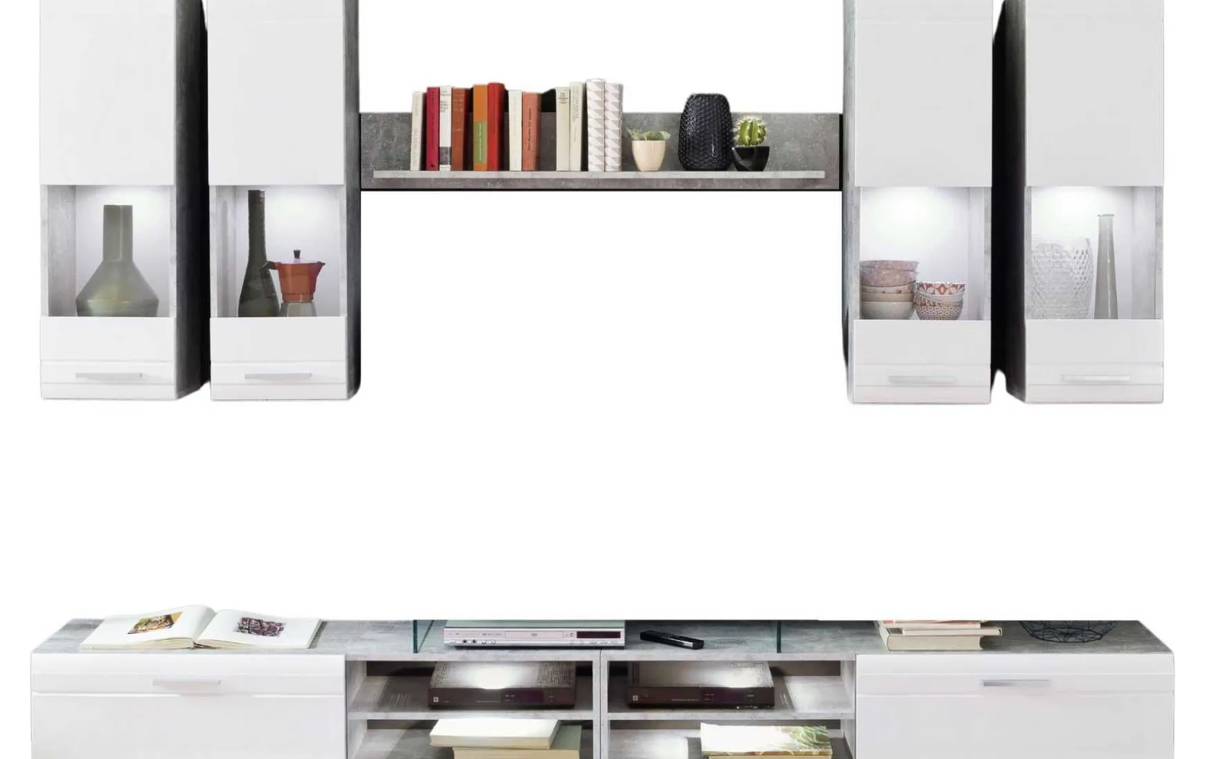 Die moderne Wohnwand Weiß Hochglanz mit Stone Dekor kombiniert zeitgemäßes Design mit praktischer Funktionalität und bietet eine stilvolle Lösung für Ihr Wohnzimmer. Mit einer eleganten Optik und cleveren Stauraumoptionen fügt sie sich harmonisch in verschiedene Einrichtungsstile ein und sorgt für eine aufgeräumte Atmosphäre. Dank des neutralen und dennoch auffälligen Designs lässt sich die Wohnwand mit verschiedenen Möbelstücken kombinieren und eignet sich für verschiedene Raumgrößen. Sie kann sowohl als klassische TV-Wand als auch als vielseitiger Stauraum in anderen Bereichen des Hauses genutzt werden.