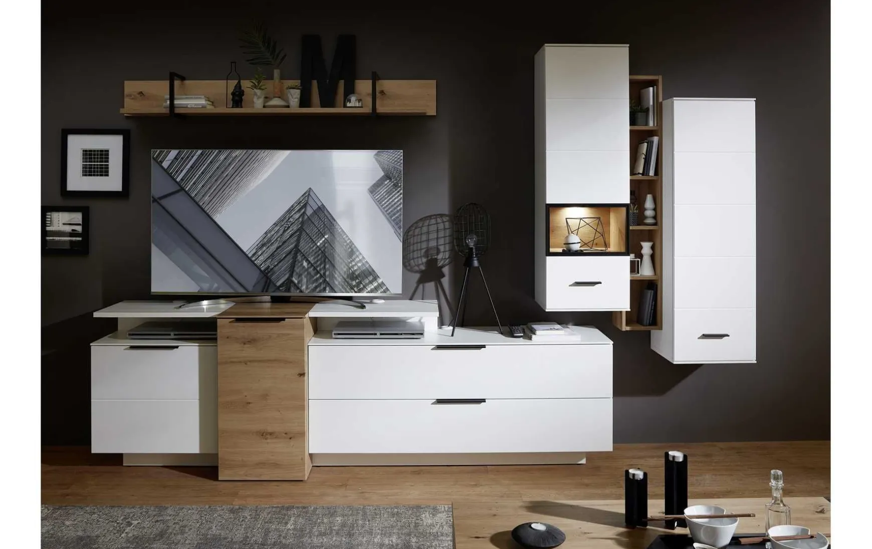 Diese moderne Wohnwand überzeugt durch ihr klares Design und die harmonische Kombination aus weißem Supermatt-Lack und warmem Artisan-Eiche-Dekor. Die durchdachte Zusammenstellung aus TV-Elementen, Hängeschränken, Regal und Wandboard bietet viel Stauraum und setzt Ihren Wohnbereich stilvoll in Szene. Schwarze Metall-Griffleisten und die integrierte LED-Beleuchtung unterstreichen den zeitgemäßen Charakter und sorgen für ein elegantes Ambiente.