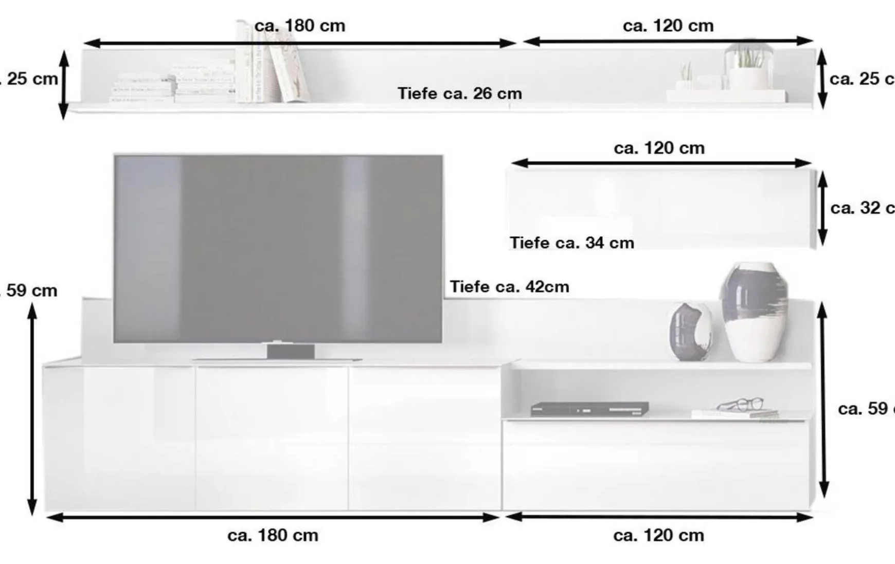Auf einer Breite von ca. 300 cm (je nach Stellweise) bieten Ihnen verschiedene Elemente, eine Menge Platz zur Aufbewahrung Ihrer alltäglichen Wohnutensilien. Als zentrales Element dient das TV-Lowboard, welches aus 2 Teilen besteht. Insgesamt verfügt das Board über 3 Türen. 1 Schublade und 1 offenes Fach für Ihre Receiver und/oder der Spielekonsole. Außerdem lässt sich Ihr TV auf der Ablage optimal positionieren und weitere Accessoires oder Blumen finden hier ebenfalls ein passendes Plätzchen.