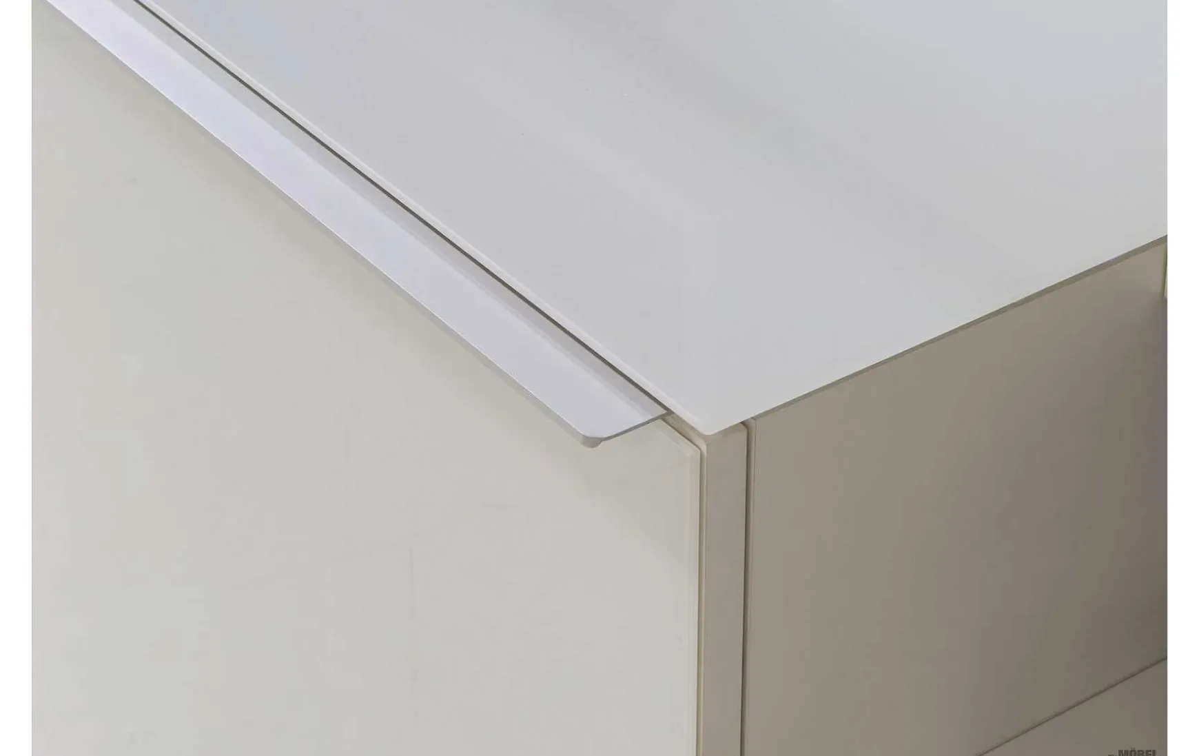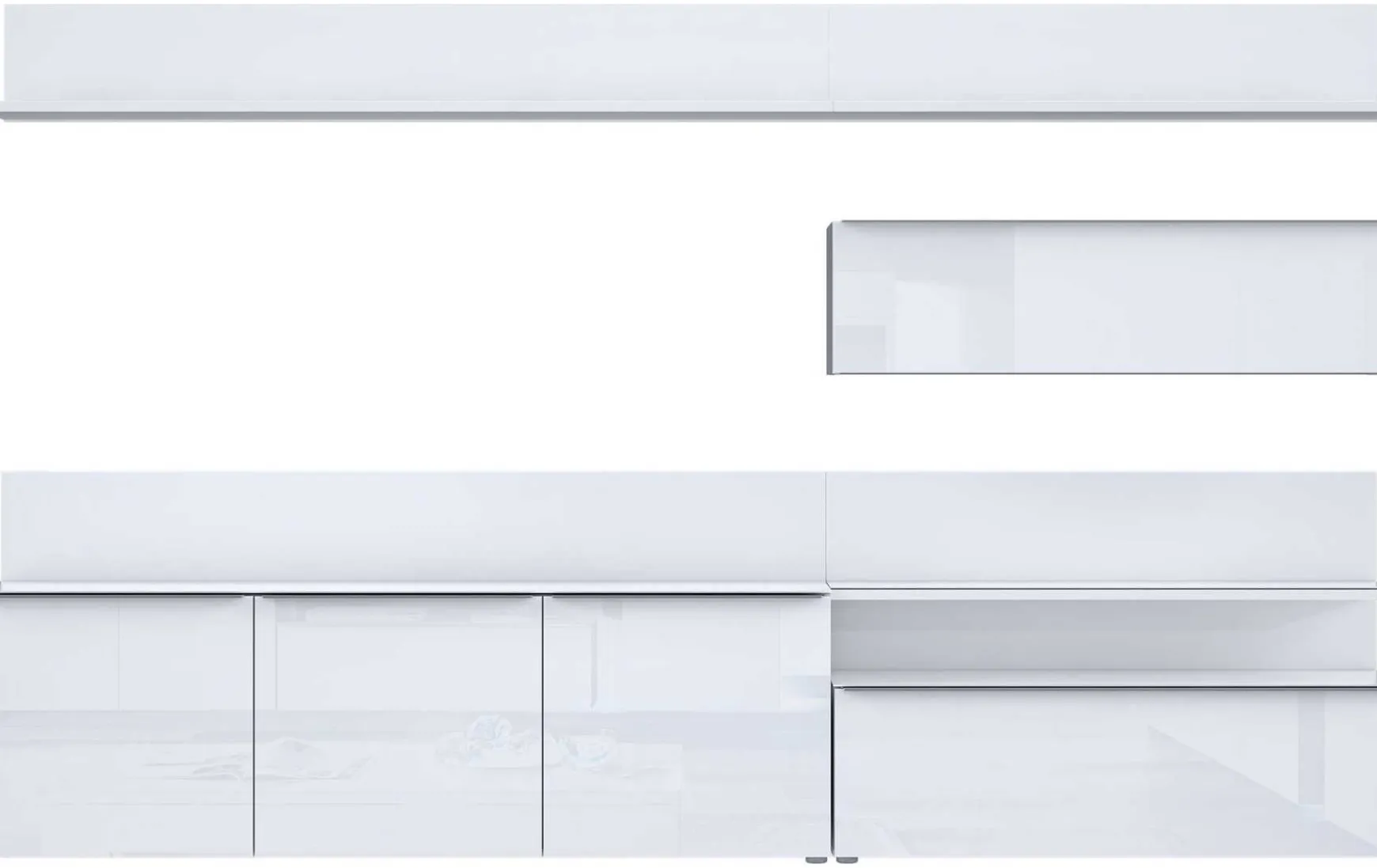 Diese stilsichere und zeitlose Wohnwand in weißer Fronten aus Glas lässt sich mit verschiedenen Einrichtungsstilen kombinieren und die alufarbenen Griffleisten vollenden den modernen Look.