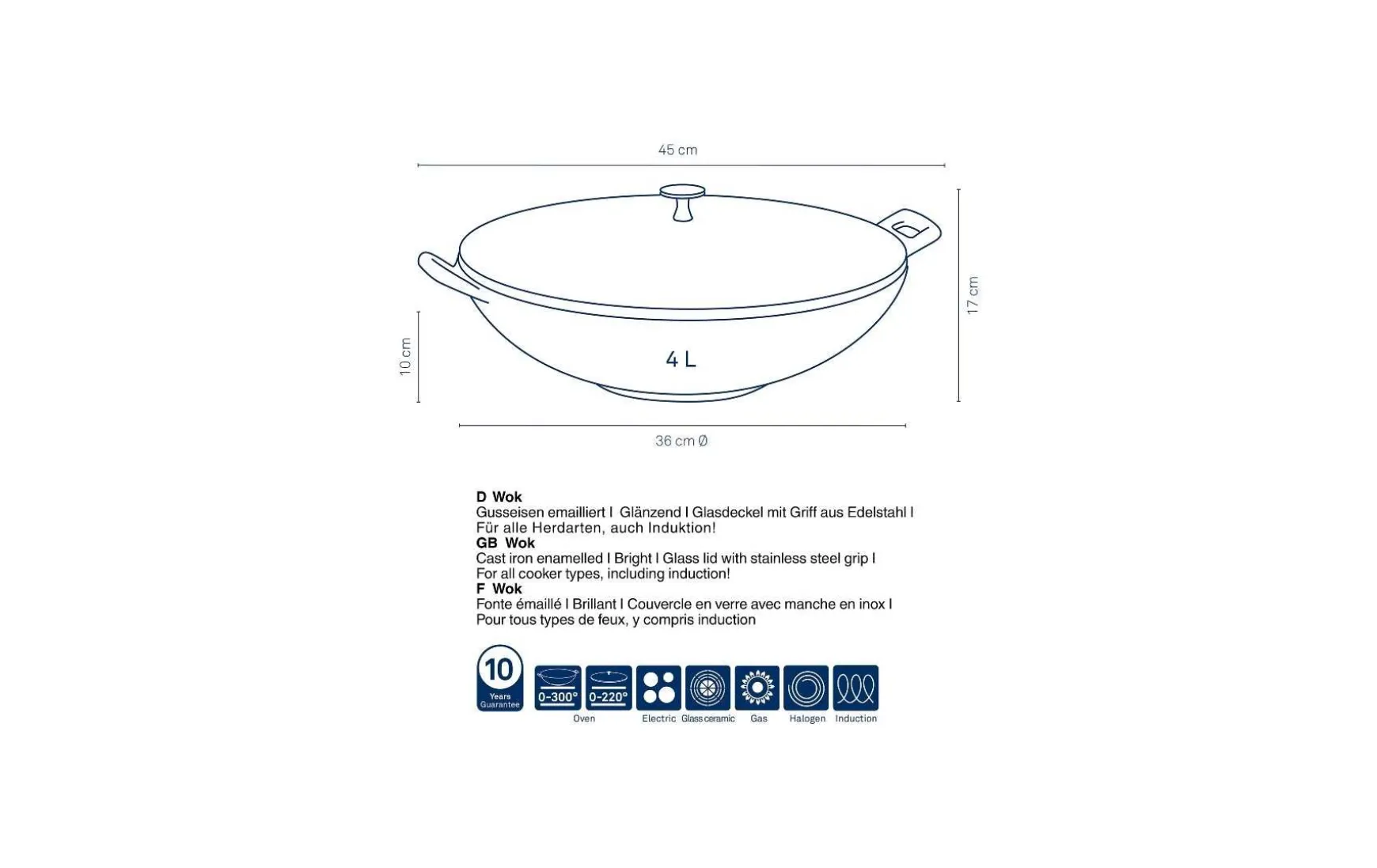 Egal ob garen oder braten. Kochen im Wok macht Spaß, kann abwechslungsreich sein und das Kochergebnis ist gesund. Die Vorgehensweise bei den meisten Wok-Gerichten ist dabei immer dieselbe. Zuerst werden die Zutaten kurz angebraten und anschließend zurückhaltend weitergegart. Unterschiede gibt es bei den Woks dabei in Material, Höhe und Form. Er besitzt zudem einen Glasdeckel mit Edelstahlgriff. Der Wok ist innen Schwarz und rau emailliert. Nutzbar bis 220° C, ohne Deckel bis 300° C.