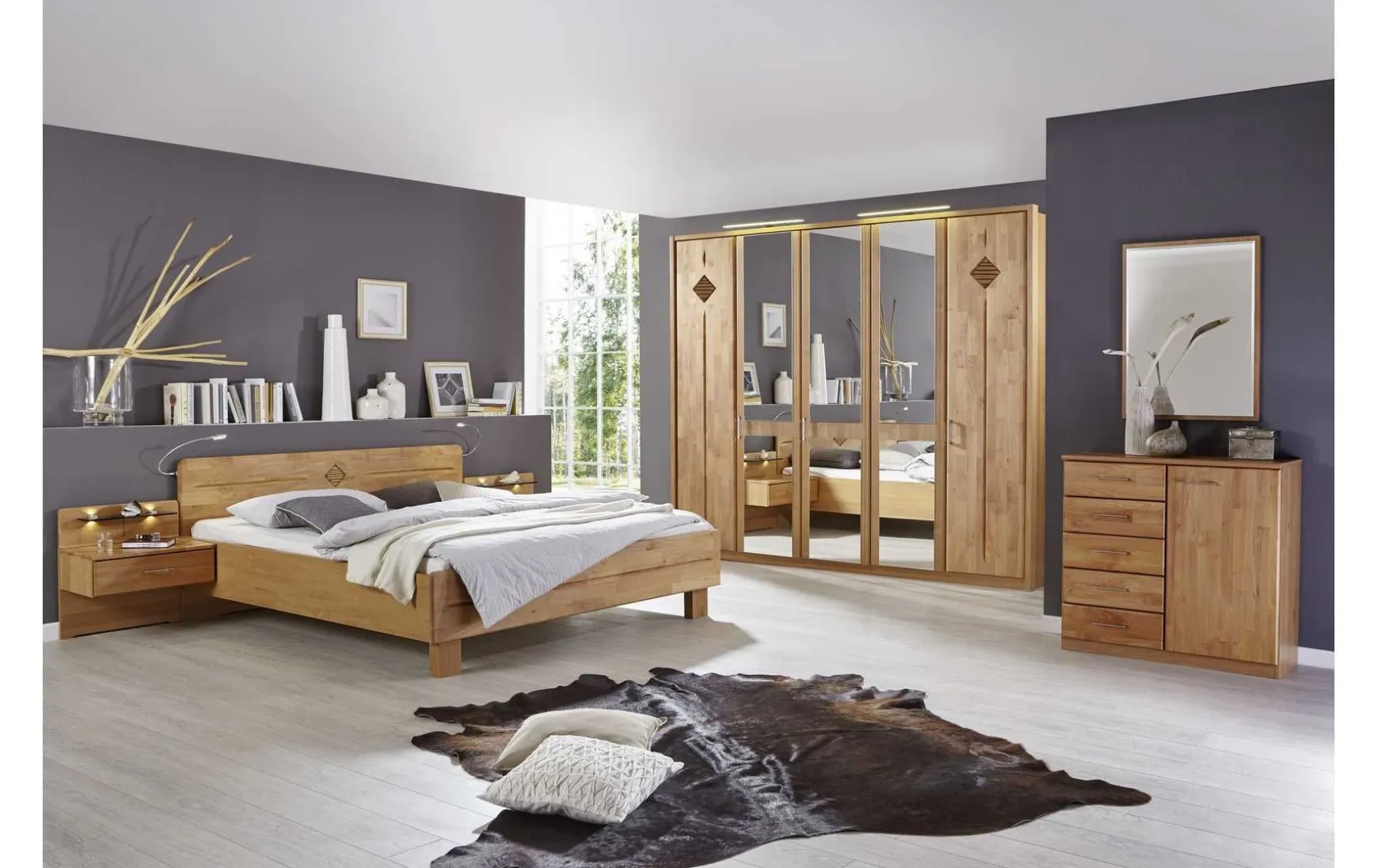 Dieses massive Schlafzimmer strahlt Wärme und Gemütlichkeit aus und passt wunderbar in jeden Raum. Zum Lieferumfang gehört der 5-türige Drehtürenschrank. Mit 3 Spiegeltüren bietet er mit seinen 6 inkludierten Fachböden sowie 3 Kleiderstangen, jede Menge Platz zum Einräumen und Aufhängen.