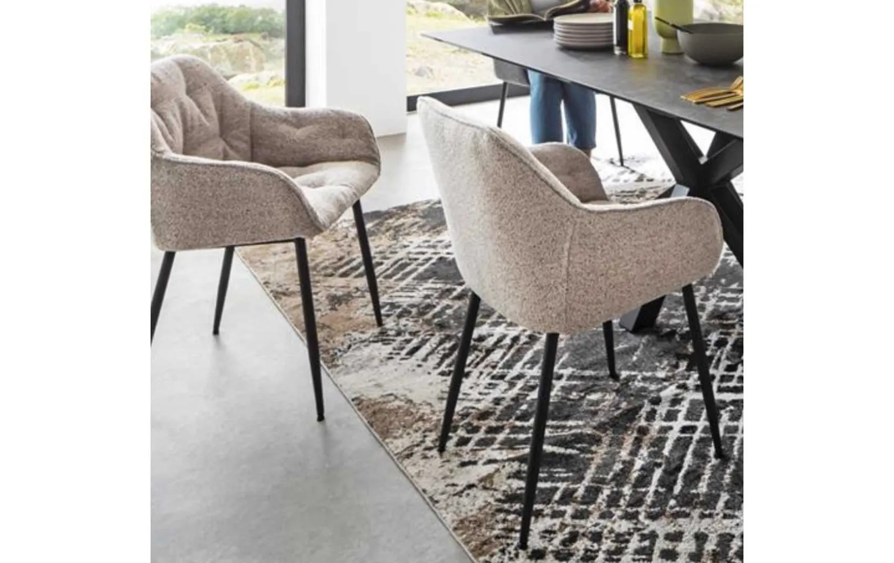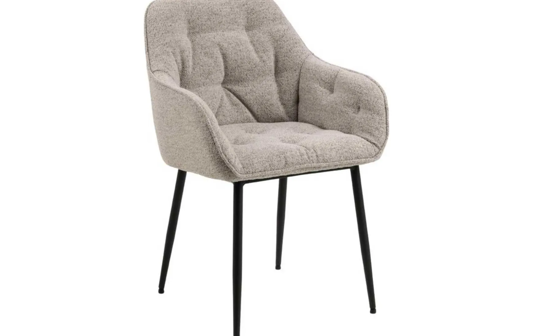 Die Kombination aus beigem Stoffbezug und schwarzem Metalllgestell machen diesen Stuhl zur idealen Wahl, wenn es darum geht, eine moderne und zugleich sanfte Wohnatmosphäre zu schaffen. Bequem gepolstertet und mit hohen Armlehnen versehen, lädt der Stuhl zum Sitzen und Entspannen ein und bietet so auch bei längerem Verweilen ein ideales Sitzerlebnis. Die attraktive Rautenheftung auf der Sitzfläche und am Rücken vervollständigen den modernen, nordischen Look und machen den Stuhl zu einem echten Blickfang.