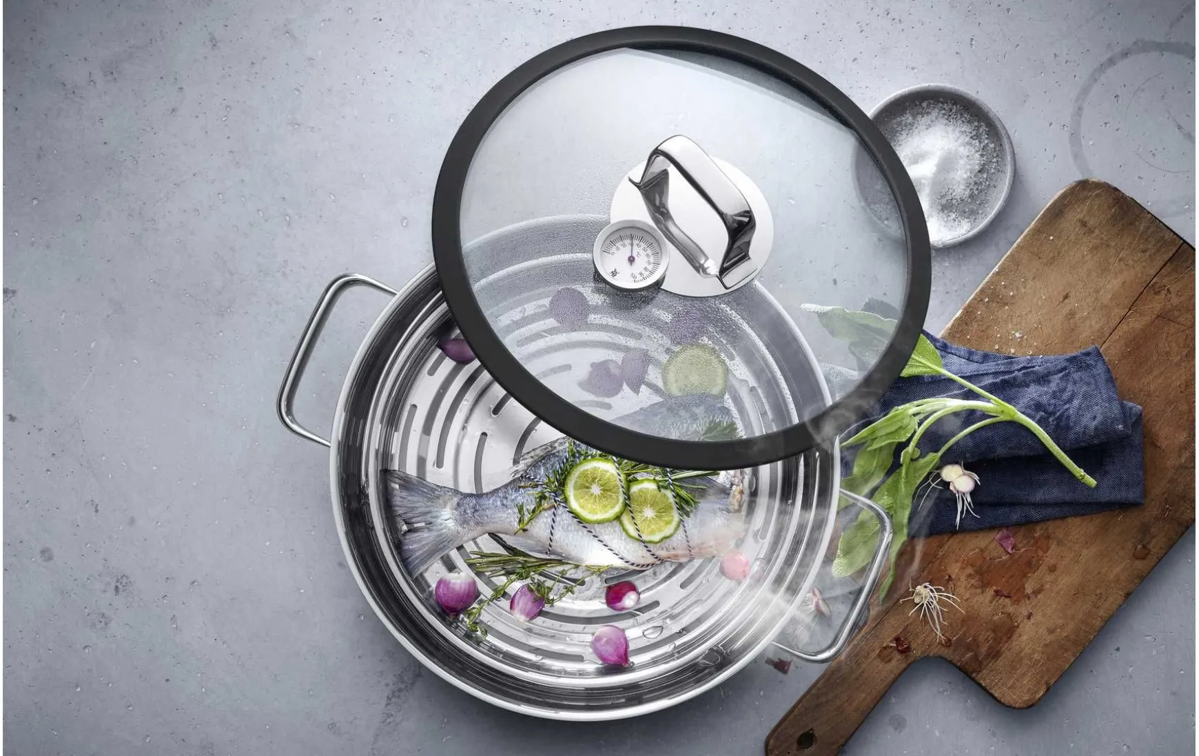 Der runde WMF Vitalis Aroma-Dampfgarer bringt jede Menge gesunde Abwechslung in die Küche: