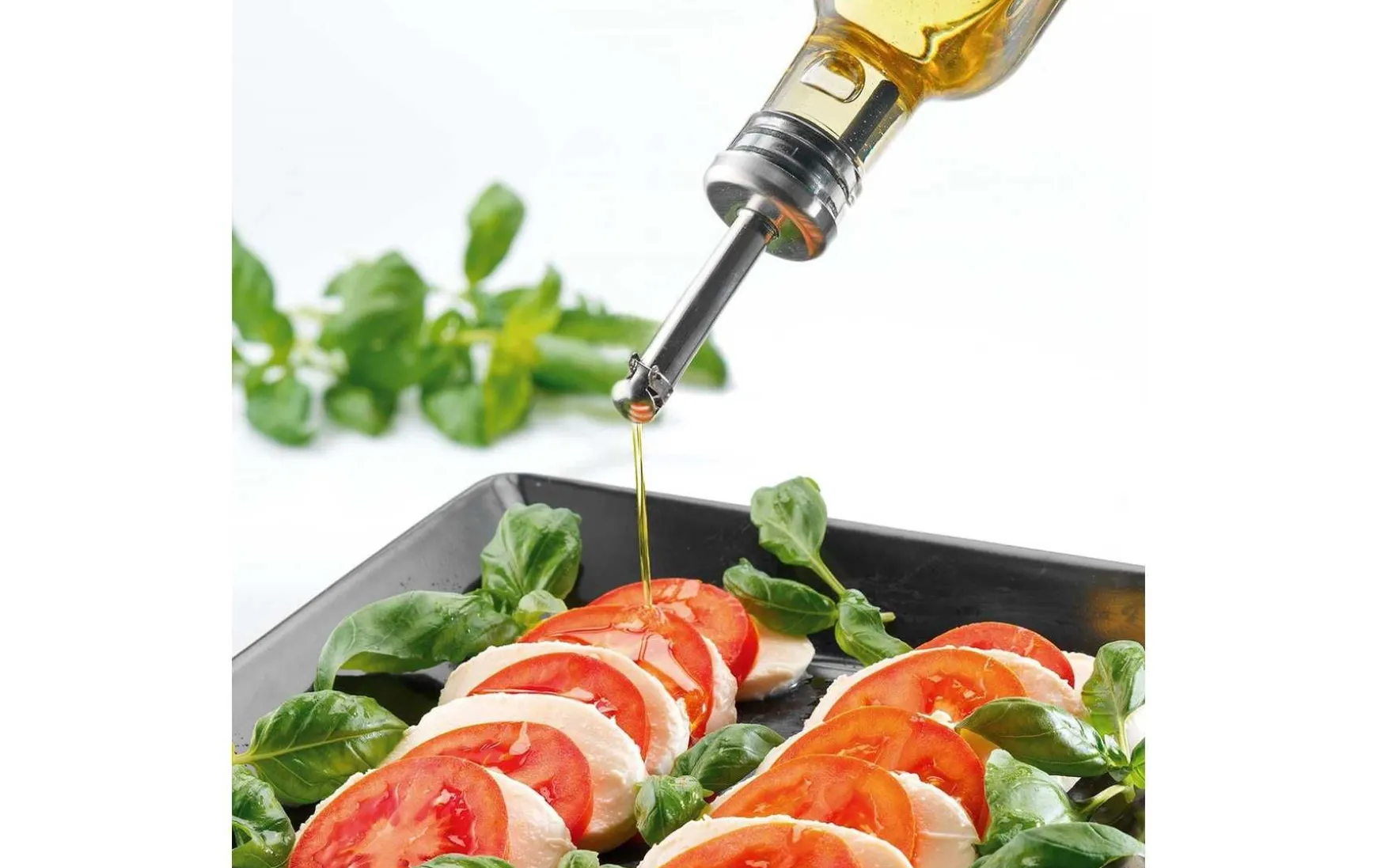 Der Ausgießer kommt direkt im Zweierpack, damit sowohl Öl- als auch Essigflaschen gleichzeitig versorgt sind. Das genaue Dosieren von Öl und Essig wird damit zum Kinderspiel.