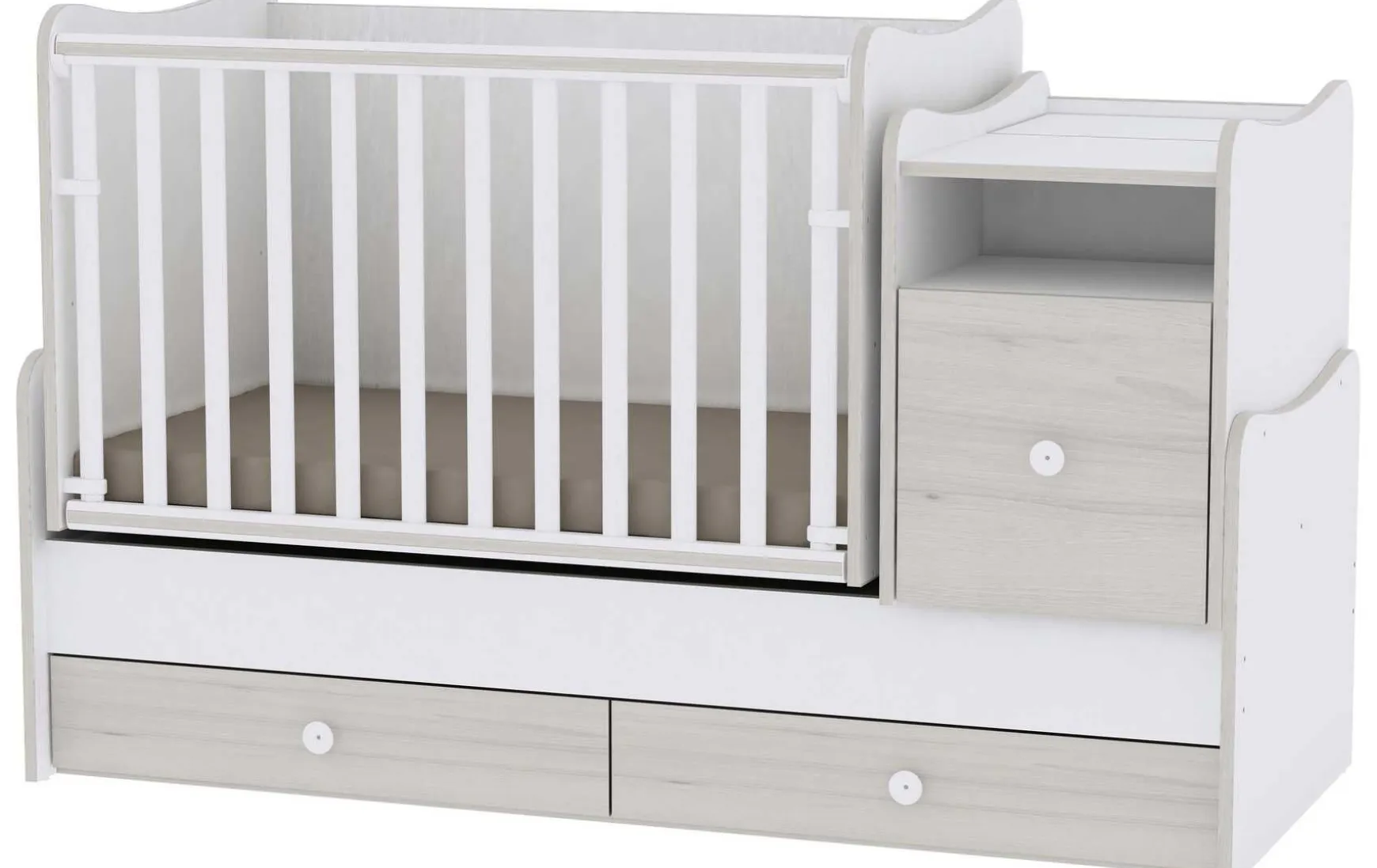 Dieses vielseitige Babybett mit integrierter Wiegefunktion ist eine durchdachte Komplettlösung für das Babyzimmer. Neben dem Babybett sind eine Wickelkommode, praktische Schubladen sowie ein Bettkasten bereits inklusive und sorgen für maximalen Komfort und Stauraum auf kleinem Raum. Der höhenverstellbare Lattenrost unterstützt ein rückenschonendes Handling im Alltag. Besonders praktisch: Dank der mitgelieferten Umbauseiten lässt sich das Bett später problemlos in ein Junior- bzw. Kinderbett umwandeln. Das moderne Design in Light Oak und Weiß fügt sich harmonisch in unterschiedliche Einrichtungsstile ein und kann ideal mit weiteren Möbeln kombiniert werden.