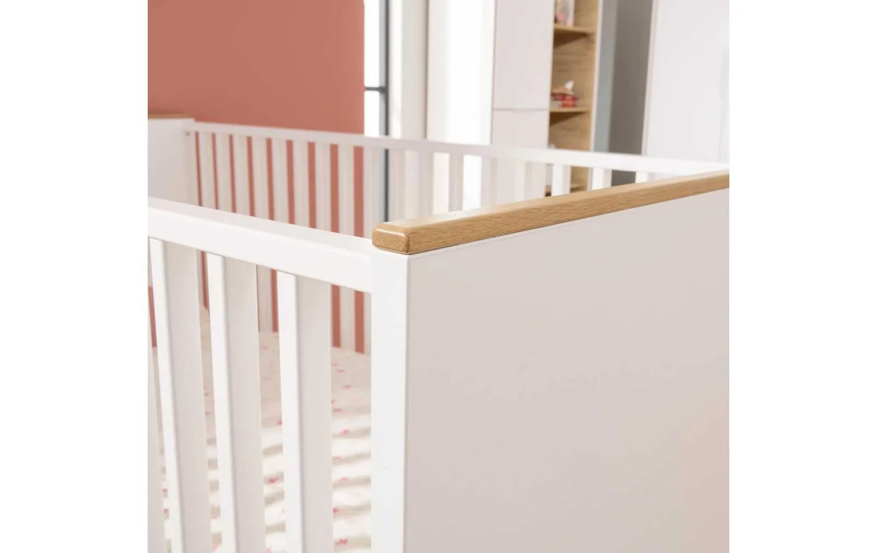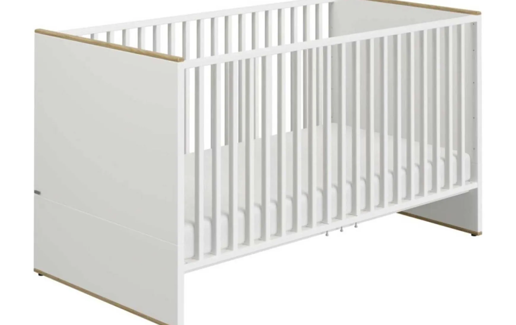 Dieses Babybett bietet mit seinen klaren Linien und der warmen Farbkombination von Kreideweiß und Eiche-Montana-Nachbildung Raum für schöne Träume. Das helle, freundliche Design und die eleganten Gitterseiten lassen Licht und Luft hindurch. Das mitwachsende Kinderbett lässt sich dank des 4-fach verstellbaren AIRWELL Comfort-Federleistenrost auf jede Wachstumsphase Ihres Kindes einstellen und sorgt gemeinsam mit den Bettsprossen für maximale Sicherheit im Babyzimmer. Die Liegefläche hat eine Größe von 70×140 cm.