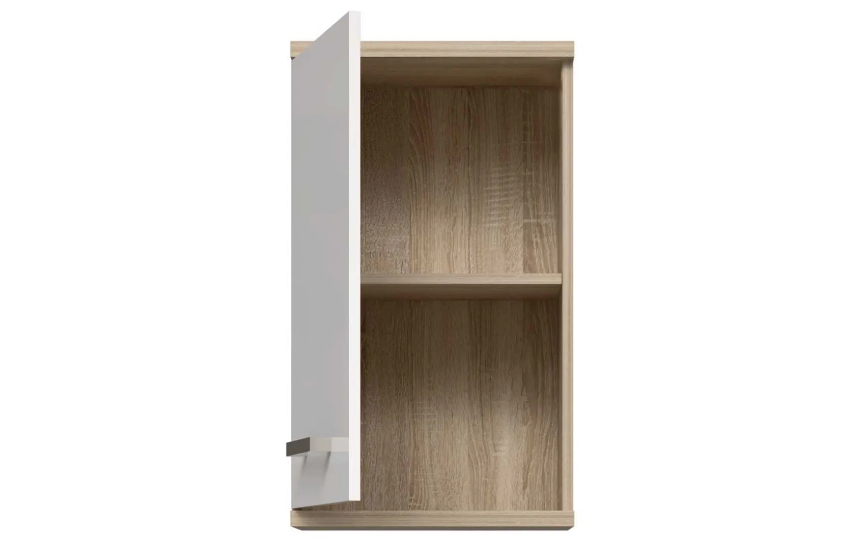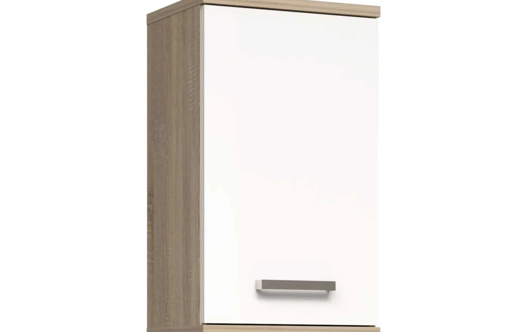 Dieser Badezimmer-Hängeschrank überzeugt durch klare Linien und eine moderne, glänzende Front in Weiß. Der Korpus in Eiche Sonoma Dekor verleiht dem Schrank eine natürliche Note. Die Edelstahlgriffe sind hochwertig verarbeitet und können wahlweise links oder rechts montiert werden. Hinter der Tür bietet ein Einlegeboden praktischen Stauraum für Badutensilien. Der hängende Badschrank ist platzsparend, pflegeleicht und ideal für moderne Badezimmer. Lieferung erfolgt zerlegt, Dekoration ist nicht im Lieferumfang enthalten.