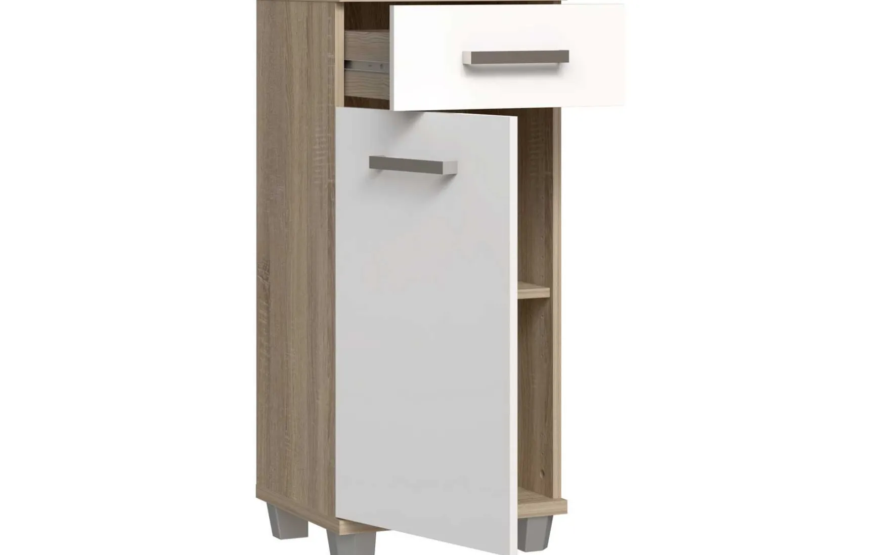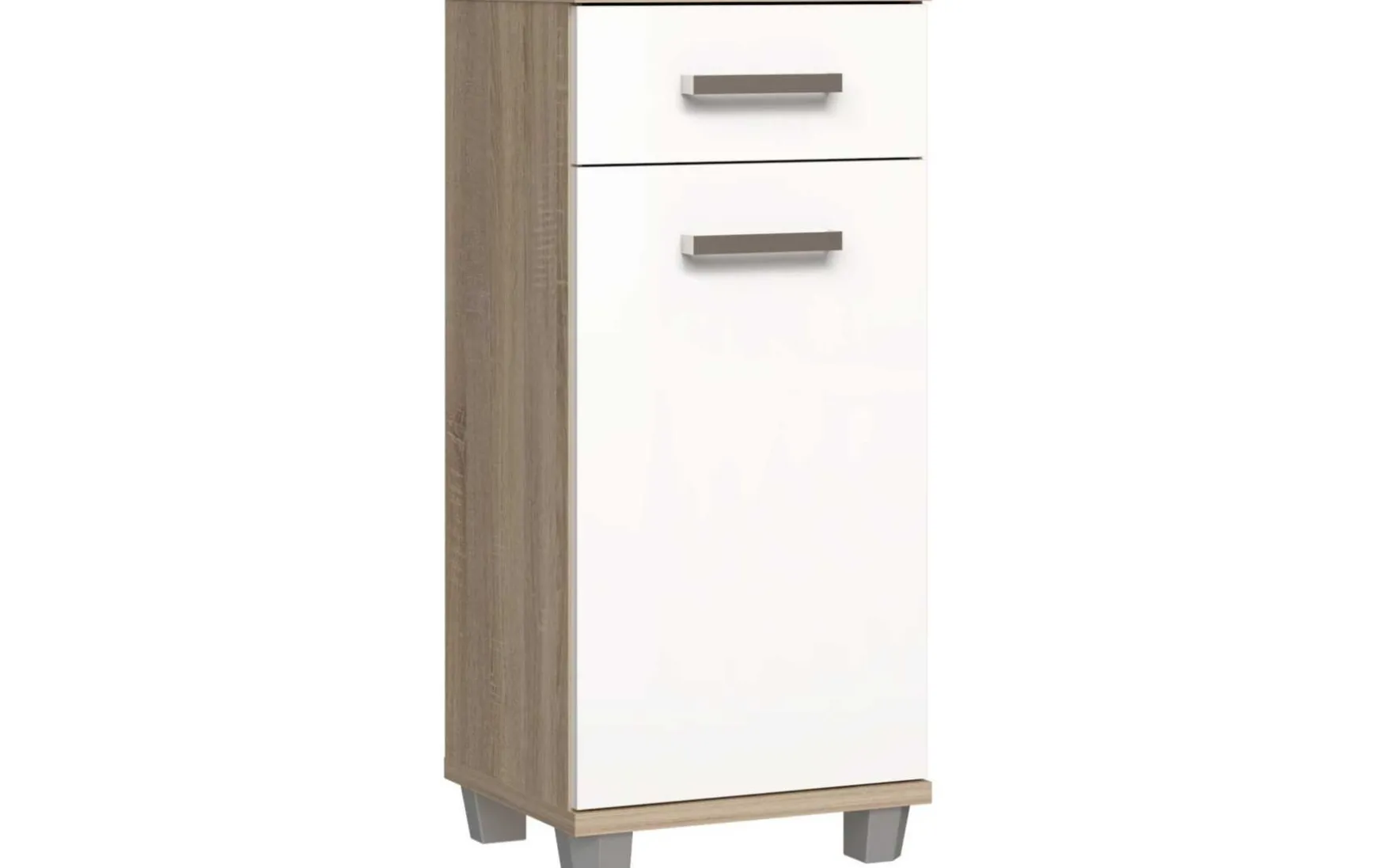 Die Badezimmer-Kommode im charmanten Landhausstil verbindet zeitloses Design mit praktischer Funktionalität. Der Korpus in Sonoma Eiche harmoniert perfekt mit der weiß glänzenden Front und den Griffen in Metall-Optik. Eine Schublade und eine Tür bieten ausreichend Stauraum für Handtücher und Badutensilien. Die pflegeleichte, melaminharzbeschichtete Oberfläche lässt sich einfach trocken abwischen. Stehend konzipiert und ideal für kleinere Bäder geeignet. Lieferung erfolgt zerlegt, Dekoration ist nicht im Lieferumfang enthalten.
