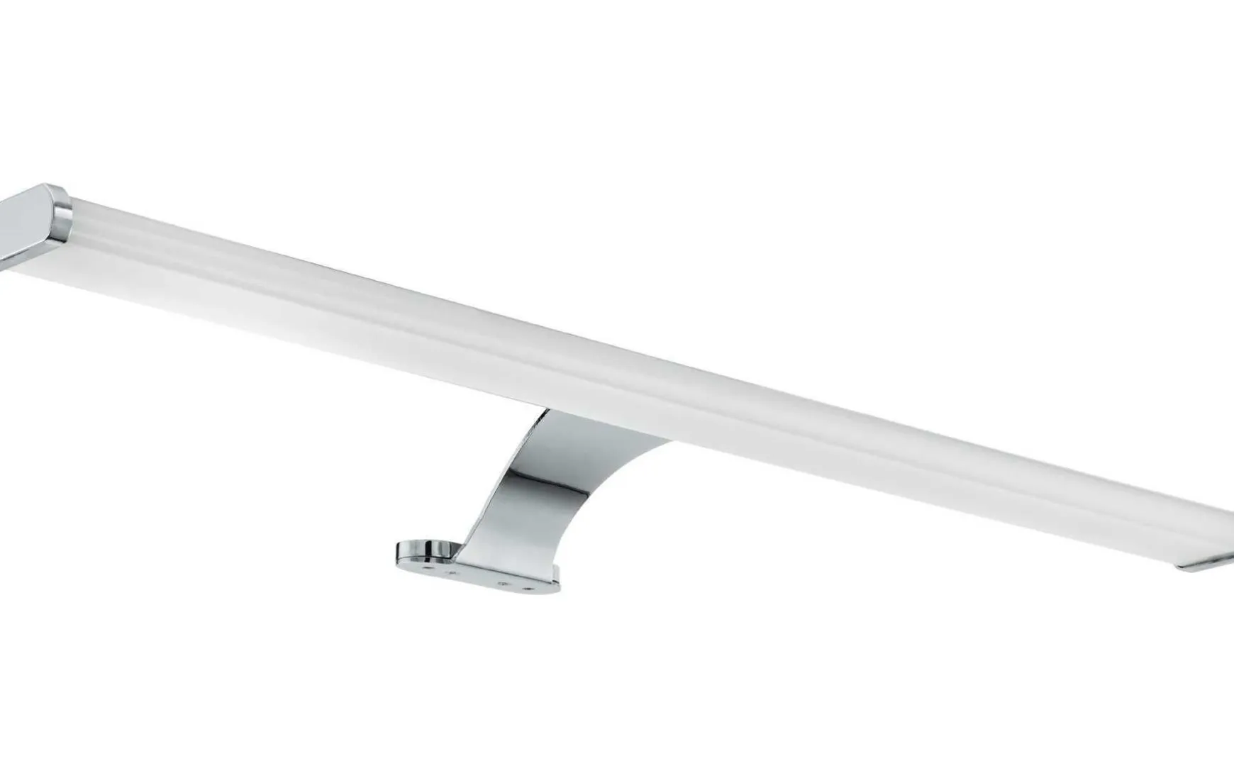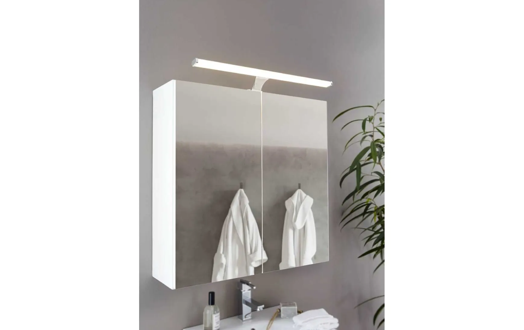 Die integrierten LEDs spenden homogenes warmweißes Licht und sind nicht sichtbar. Die Wandleuchte fügt sich mit ihrer Länge von 60 cm nahtlos in moderne Einrichtungen ein und bietet eine stilvolle Beleuchtung im Bad über dem Spiegel.