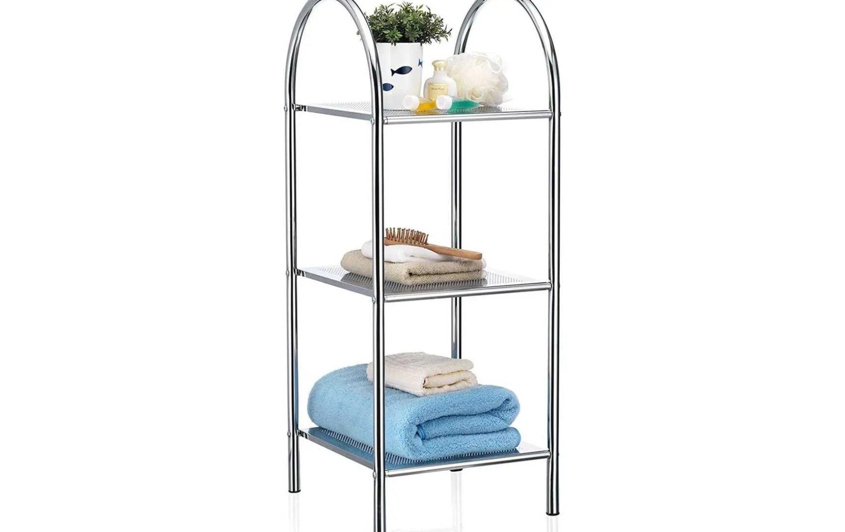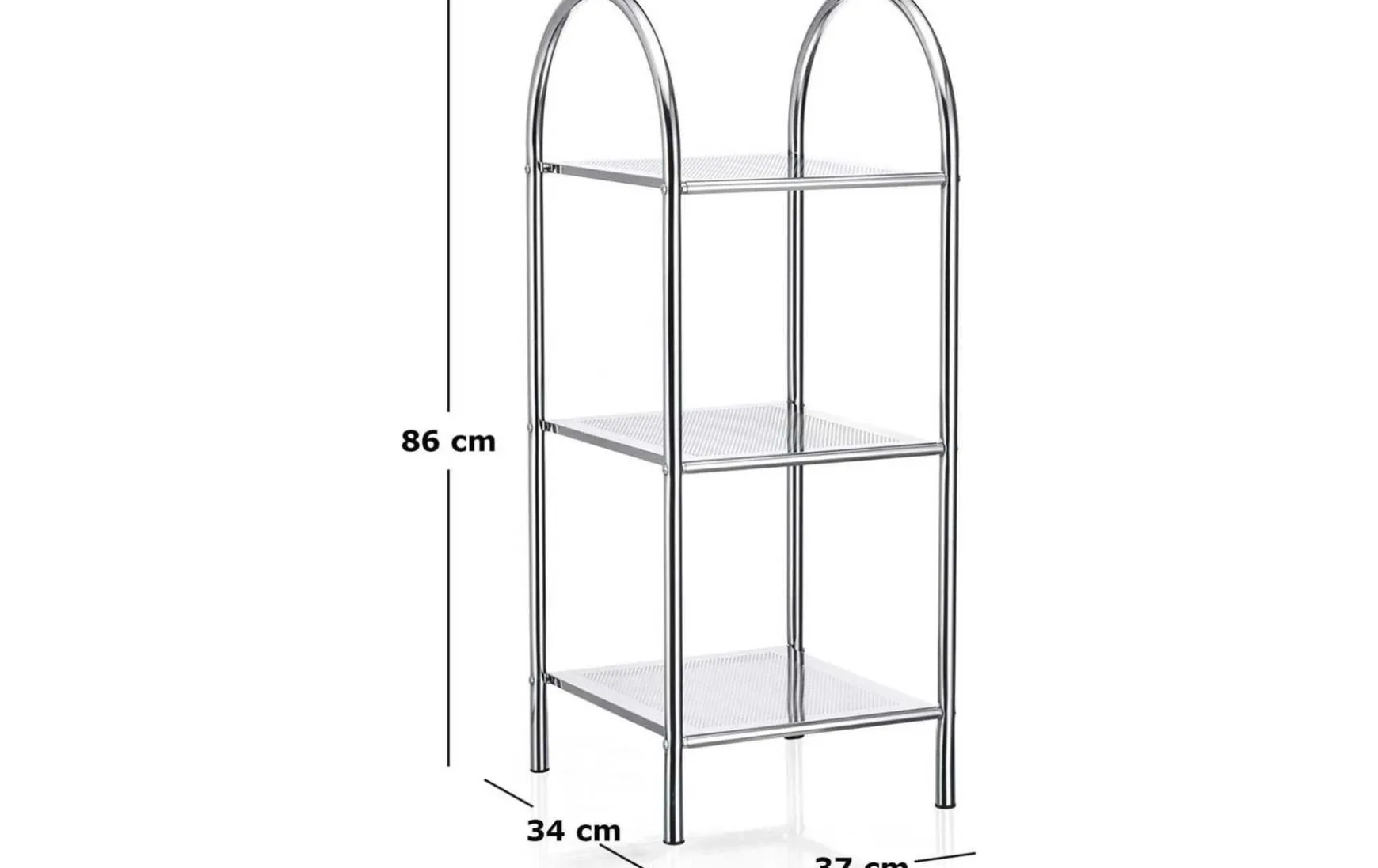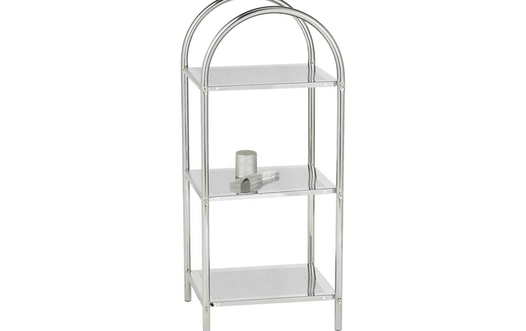 Das exklusive Haushalts- und Badregal ist ein modernes und elegantes Wohnaccessoire. Mit drei Ablagen im attraktiven Lochblech-Design bietet das Regal aus Chrom vielfältige Abstellmöglichkeiten für Handtücher, Bad- oder Küchen-Utensilien. Besonderes Detail ist der schön geformte Rundbogen, der den oberen Abschluss des Regals bildet. Durch die vier Schraubfüße zum Höhenausgleich ist Stabilität stets gewährleistet.