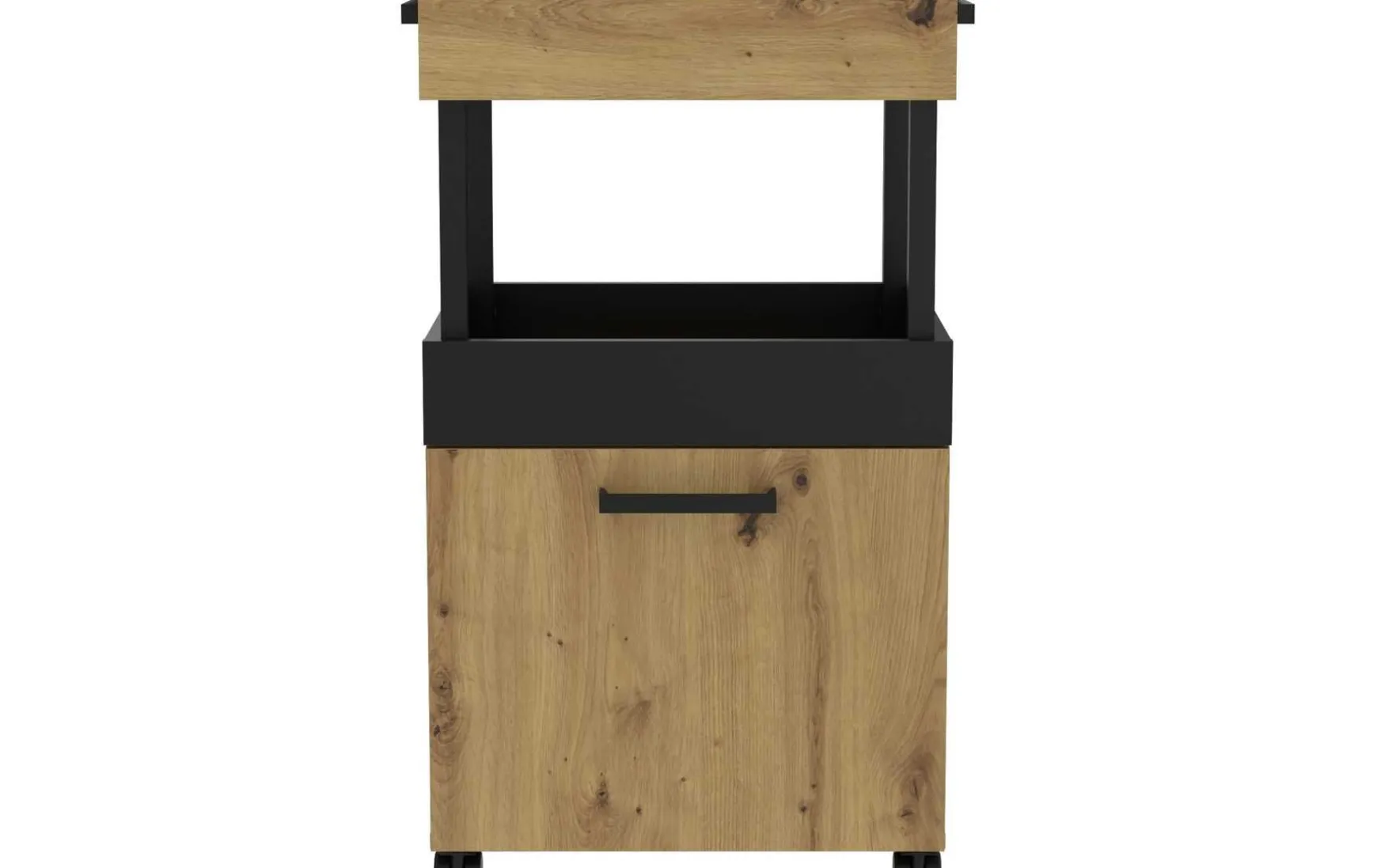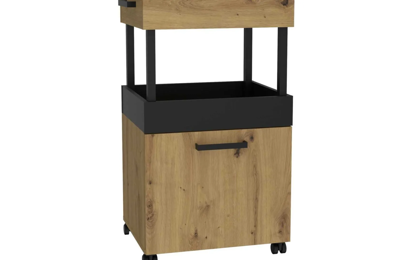 Bereiten Sie gerne Cold Brew oder Long Island Iced Teas zu? Dann eignet sich dieser Servierwagen in Eichefarben und Schwarz ideal. Elemente in Artisan-Eichefarben verleihen dem praktischen Helfer seinen behaglichen Charakter. Den mondänen Touch erhält das Möbel dank dunkler Akzente in mattem Schwarz sowie Bügelgriffen aus Metall. Verstauen Sie zahlreiche Flaschen außerhalb des Blickfeldes hinter der Drehtür. Eine Ablageplatte steht für Gläser oder Tassen bereit und auf der oberen Fläche schaffen Sie sich eine stilvolle Kaffee- oder Cocktail-Bar. Durch die 4 Rollen mit Stoppfunktion ist dieser Servierwagen in Eichefarben und Schwarz mobil einsetzbar!