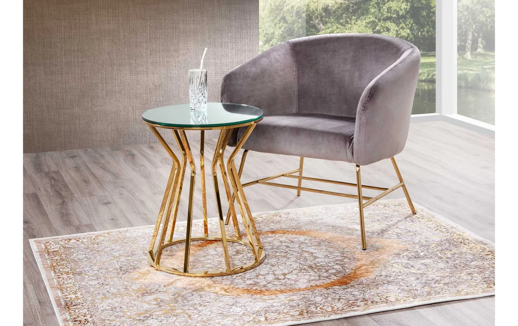 Dieser elegante Beistelltisch setzt stilvolle Akzente in Ihrem Wohnraum. Die runde Tischplatte aus edlem Spiegelglas mit einem Durchmesser von ca. 45 cm sorgt für eine luxuriöse Optik und reflektiert das Licht auf elegante Weise. Das goldfarbene Metallgestell unterstreicht das moderne, glamouröse Design. Mit einer Höhe von ca. 55 cm eignet sich der Beistelltisch ideal als dekorative Ablage neben Sofa oder Sessel und wird zerlegt geliefert.