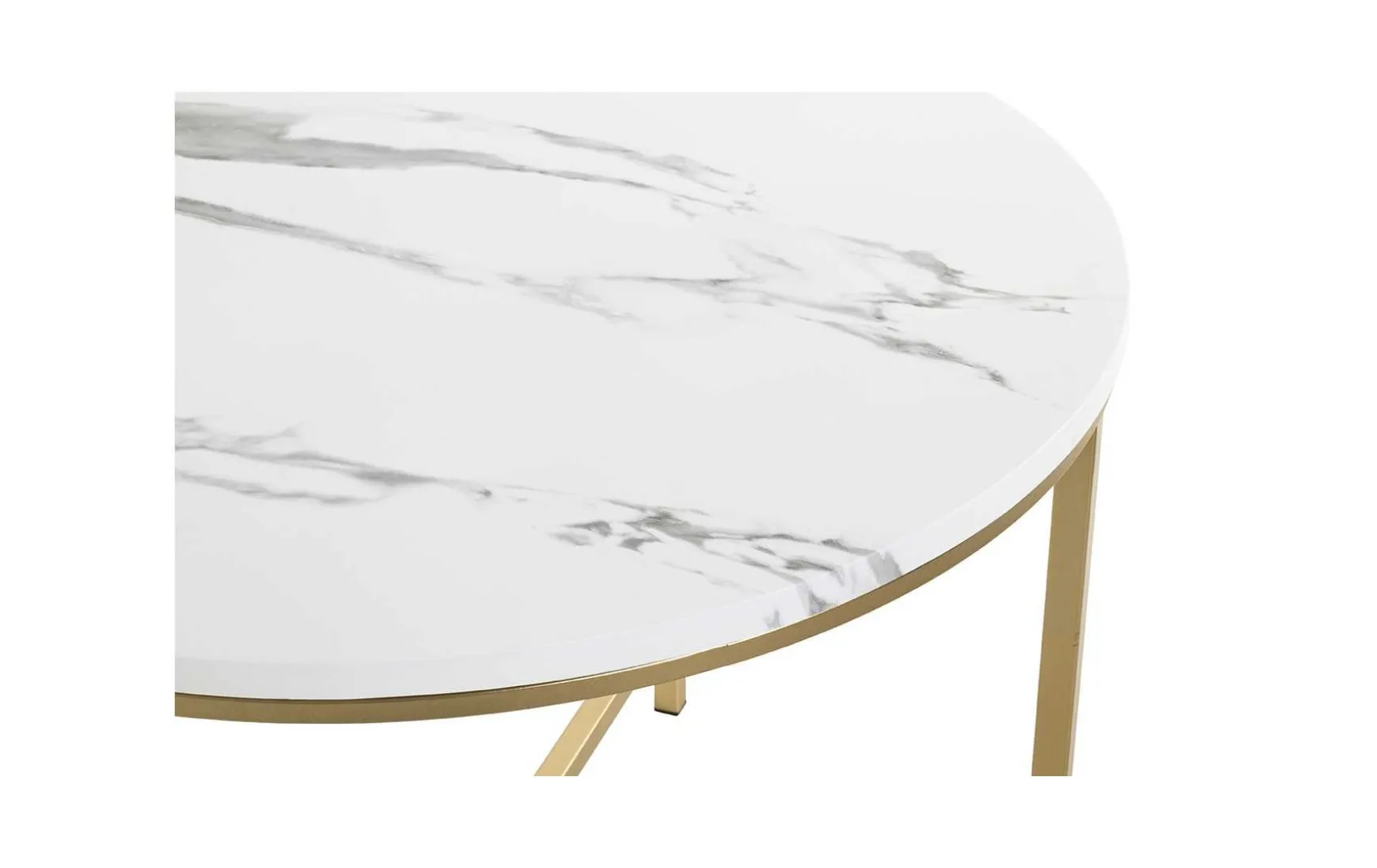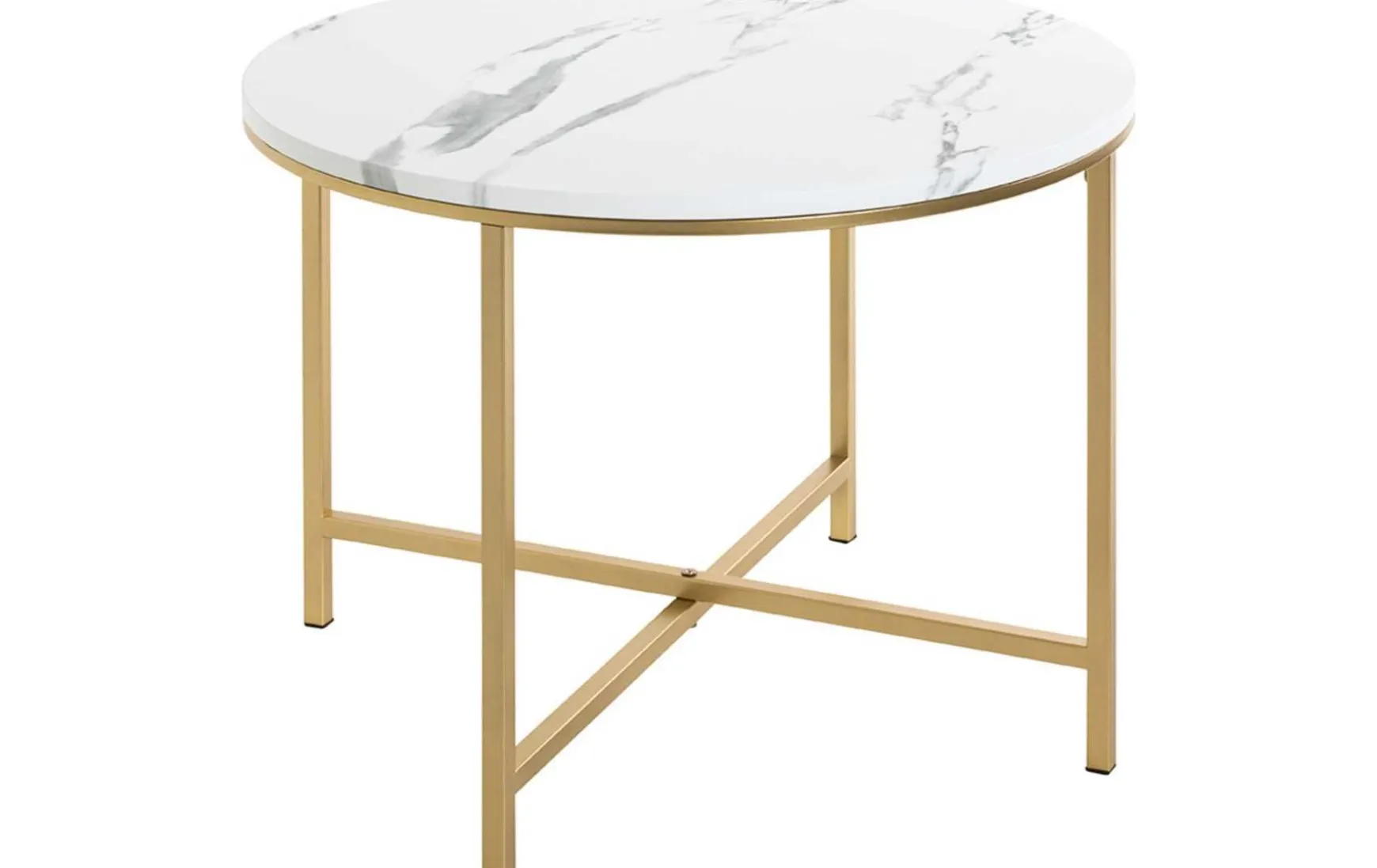 Dieser moderne Beistelltisch überzeugt durch sein elegantes Design und seine edle Tischplatte in stilvoller Marmoroptik. Die goldfarbene Gestaltung verleiht dem Tisch eine luxuriöse Ausstrahlung und macht ihn zu einem dekorativen Highlight in jedem Wohnraum. Dank der pflegeleichten Oberfläche lässt sich der Tisch mühelos reinigen und eignet sich ideal als Ablage neben Sofa oder Sessel.
