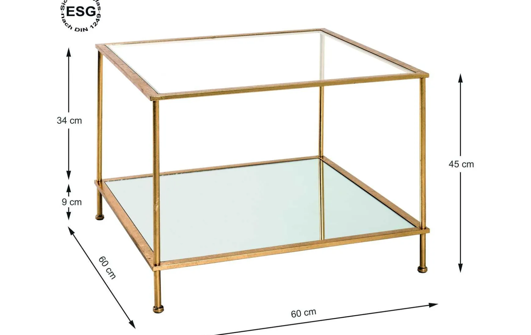 Für alle, die stilvolles Design und Eleganz in ihrem Zuhause schätzen, ist dieser Beistelltisch die perfekte Wahl. Der Beistelltisch besticht durch seine luxuriöse goldene Farbe, die jedem Raum einen Hauch von Glamour verleiht. Mit einer Höhe von 45 cm ist er ideal als zusätzliche Abstellfläche neben dem Sofa oder als stilvolles Element in Ihrem Wohnzimmer. Der rechteckige Tisch mit den Maßen 60,0 x 60,0 x 45,0 cm bietet ausreichend Platz für Ihre persönlichen Gegenstände. Die Tischplatte besteht aus klarem Glas, das einen eleganten Kontrast zum goldenen Gestell bildet. Das Metallgestell in goldener Farbe verleiht dem Beistelltisch Stabilität und sorgt für eine lange Lebensdauer. Mit einer Tragfähigkeit von 10 kg können Sie sicher sein, dass der Tisch Ihre persönlichen Gegenstände sicher tragen kann. Der untere Boden des Beistelltischs ist mit Spiegelglas ausgeführt, was nicht nur einen zusätzlichen dekorativen Effekt erzeugt, sondern Ihnen auch die Möglichkeit bietet, Ihre Lieblingsdekorationen stilvoll zu präsentieren. Der Beistelltisch wird zerlegt geliefert, sodass Sie ihn einfach und schnell montieren können. Der Tisch verfügt über keinen ABS-Kantenschutz und ist daher besonders für Haushalte ohne Kinder geeignet. Das hochglänzende Finish verleiht dem Beistelltisch einen edlen Look und macht ihn zu einem echten Blickfang in Ihrem Zuhause. Mit einem Gewicht von 9,2 kg ist der Tisch zudem leicht zu handhaben und zu bewegen.