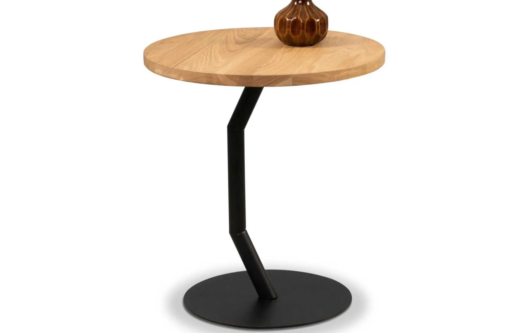 Dieser moderne Beistelltisch aus massiver Wildeiche überzeugt durch seine natürliche Ausstrahlung und klare Formensprache. Die geölte Oberfläche bringt die charakteristische Maserung des Holzes besonders schön zur Geltung und sorgt für eine warme, wohnliche Atmosphäre. Das schwarze Metallgestell bildet einen stilvollen Kontrast zur massiven Holzplatte und verleiht dem Tisch Stabilität sowie einen zeitgemäßen Look. Dank seiner kompakten, runden Form eignet sich der Beistelltisch ideal als Ablage neben Sofa, Sessel oder Bett.