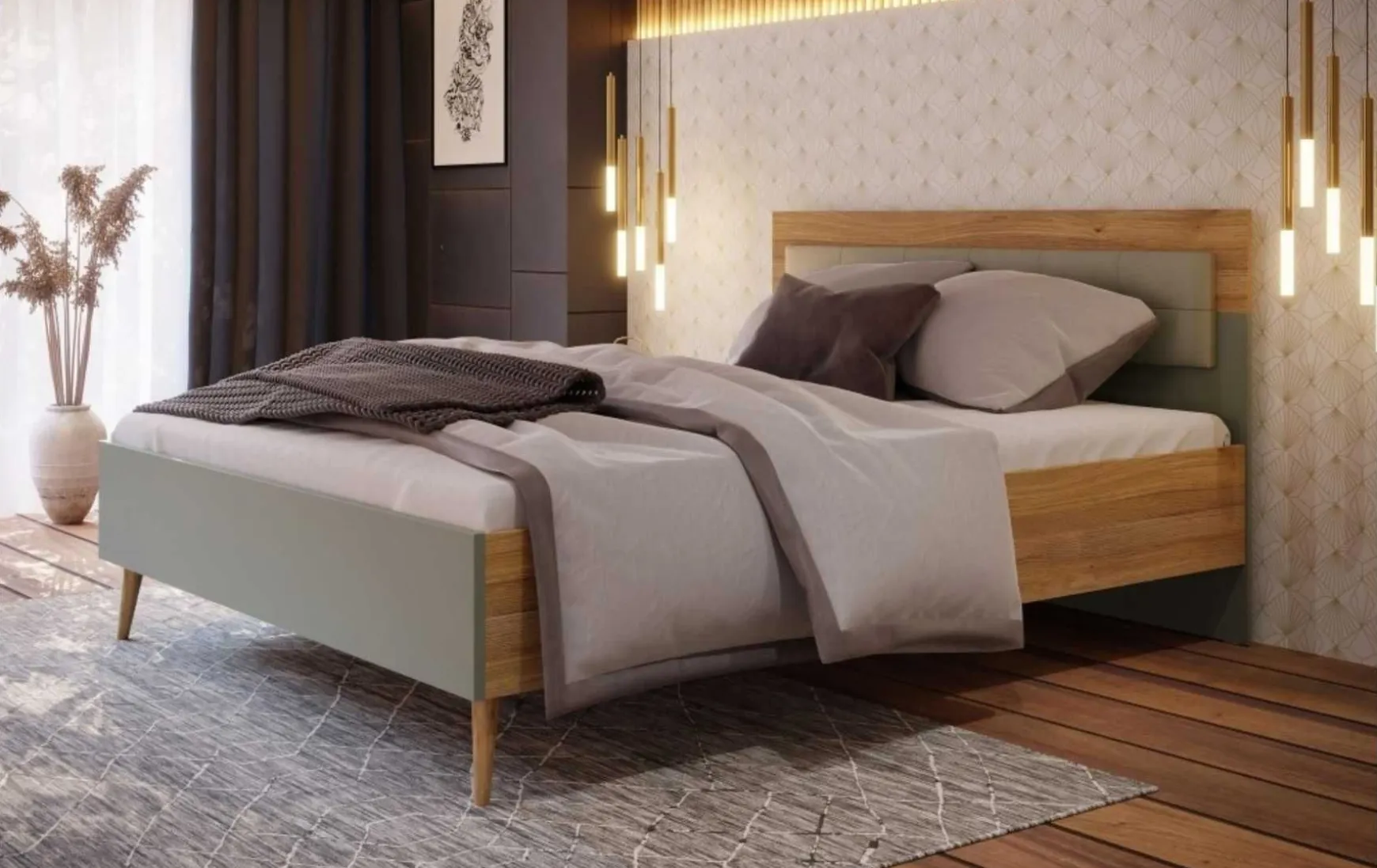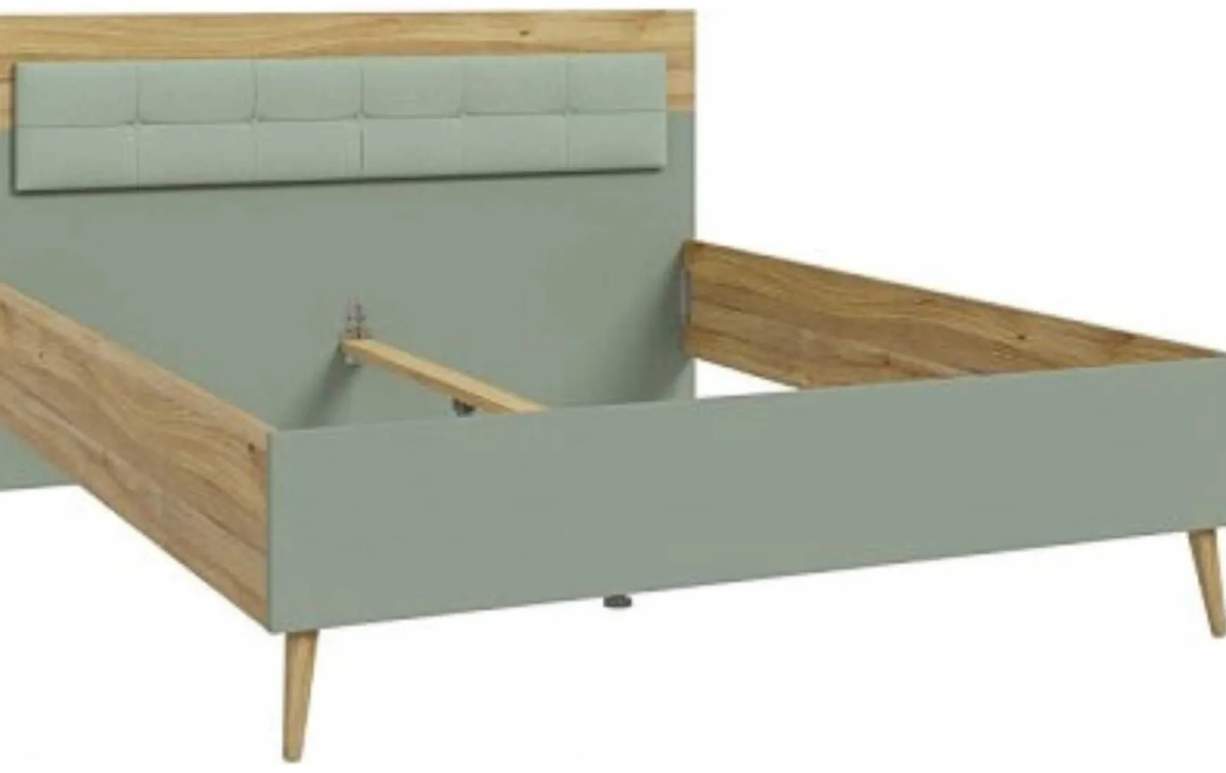 Modernes Doppelbett aus einem umfangreichen, grossen Typenprogramm in ganz neuer Farbe Mauvella Eiche abgesetzt mit dezentem Grün. Moderner, skandinavischer Look mit hohen Füssen und weichem Polsterkopfteil. Ergänzend gibts zu unserem Programm die passenden Betten, weitere Kleiderschränke, Nachtkommoden und Kommoden.