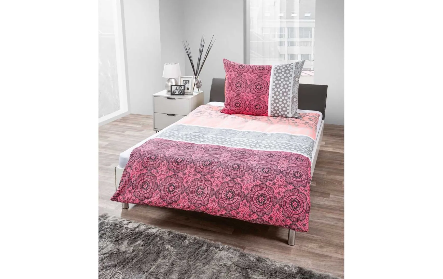 Diese Bettwäsche besteht zu 52% aus Polyester und 48% Baumwolle, damit ist die Bettwäsche pflegeleicht und bügelfrei. Der Bettbezug ist mit einem Reißverschluss ausgestattet und lässt sich somit leicht wechseln.