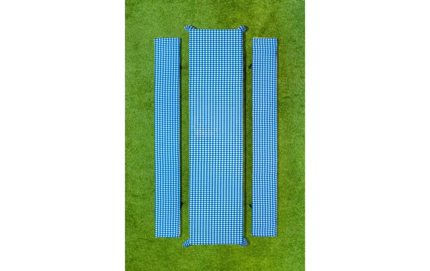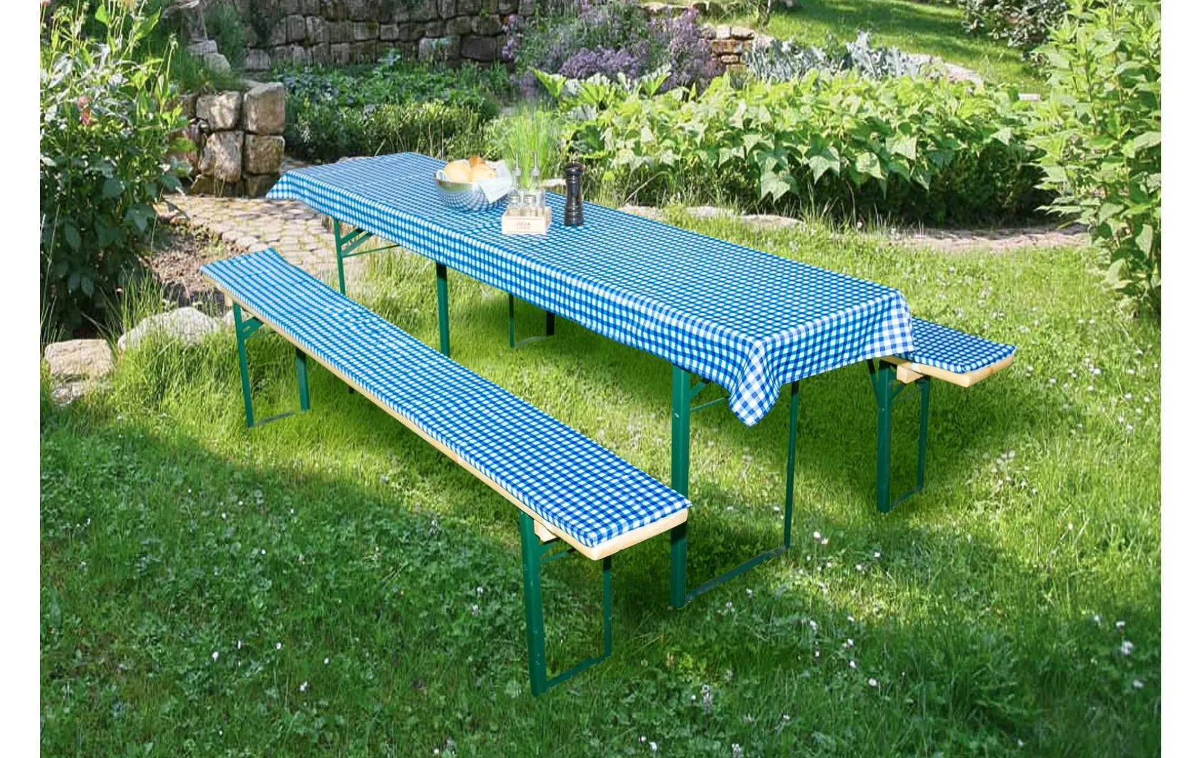 Das 3-teilige Set besteht aus einer Biertisch-Tischdecke und 2 Bierbank-Auflagen. Die beiden Bankauflagen werden mit zwei elastischen Bändern befestigt und verrutschen somit nicht.