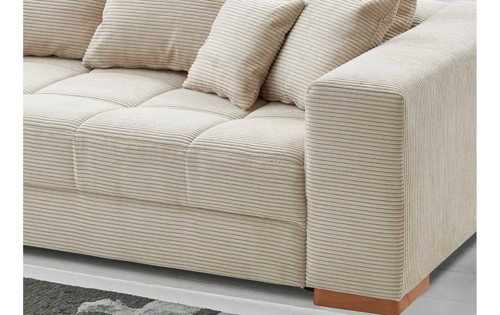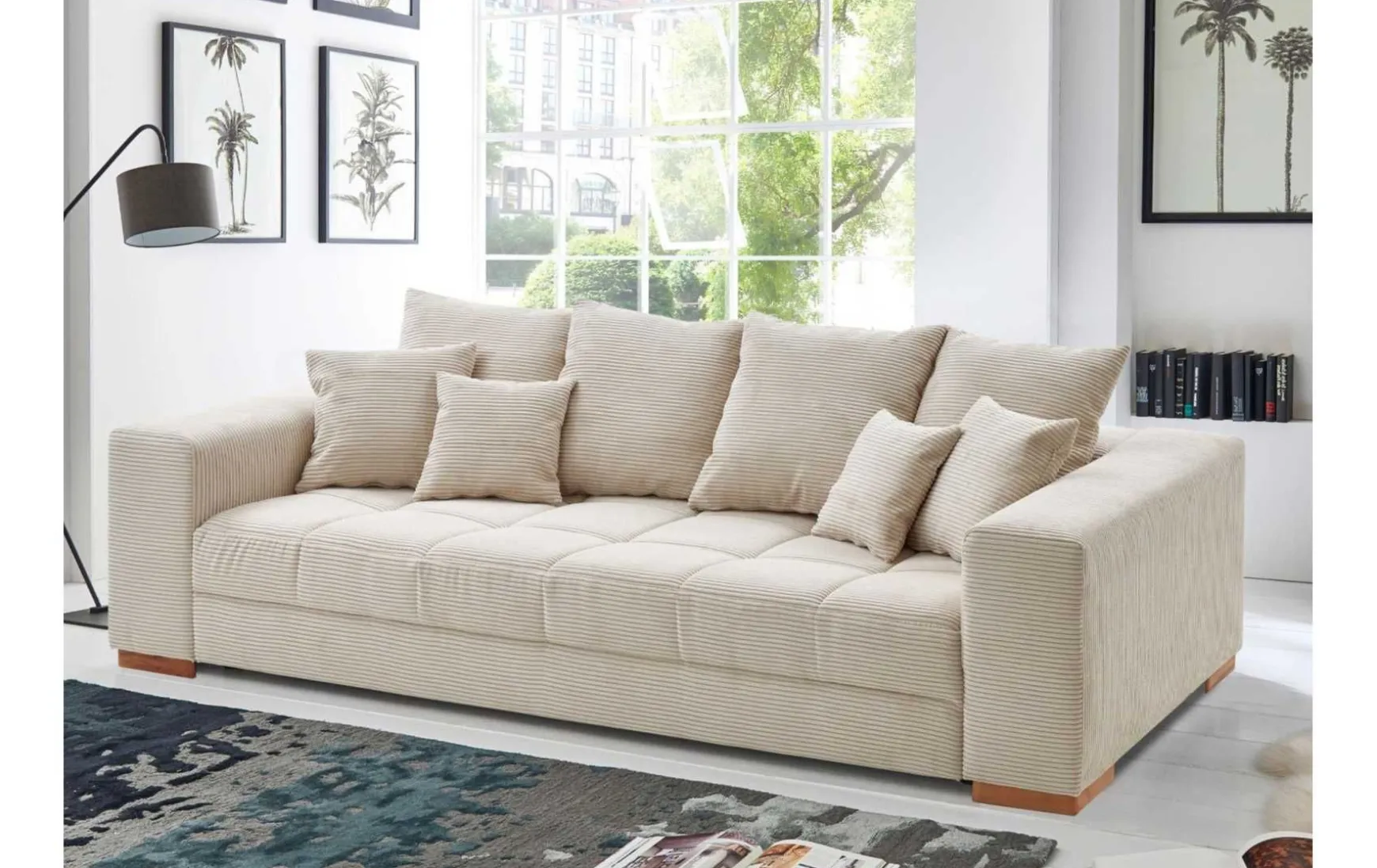 Dieses BIG Sofa besticht durch seine moderne Ausstrahlung auf einer Breite von ca. 254 cm. Der verwendete Cordbezug erfreut sich immer größerer Beliebtheit und fühlt sich zudem angenehm weich auf der Haut an. In Verbindung mit der Farbgebung in beige entsteht ein freundlicher Look, welcher sich positiv auf Ihre Wohnatmosphäre auswirken kann. Elegante Steppungen lockern das geradlinige Design auf und verleihen dem Sofa einen gemütlichen Touch. Danke des echt bezogenen Rückens können Sie das Möbel frei im Raum platzieren und Ihr Wohnzimmer flexiblen gestalten.