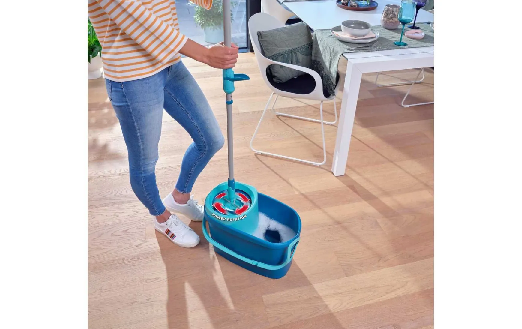 Dank einzigartigem Rotationsmechanismus im Stiel wird der Bezug so trocken und sauber, dass das System gefahrlos zum Wischen von Parkett genutzt werden kann – und das ohne kräftezehrendes Auswringen des Bezugs, ohne mühseliges Bücken und vor allem keine feuchten Hände mehr.