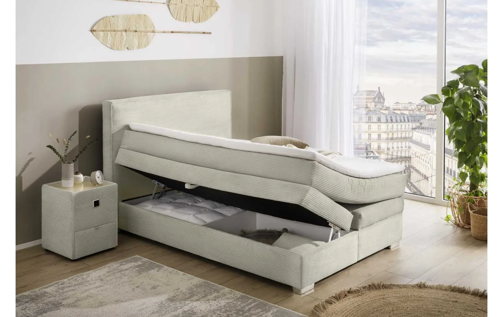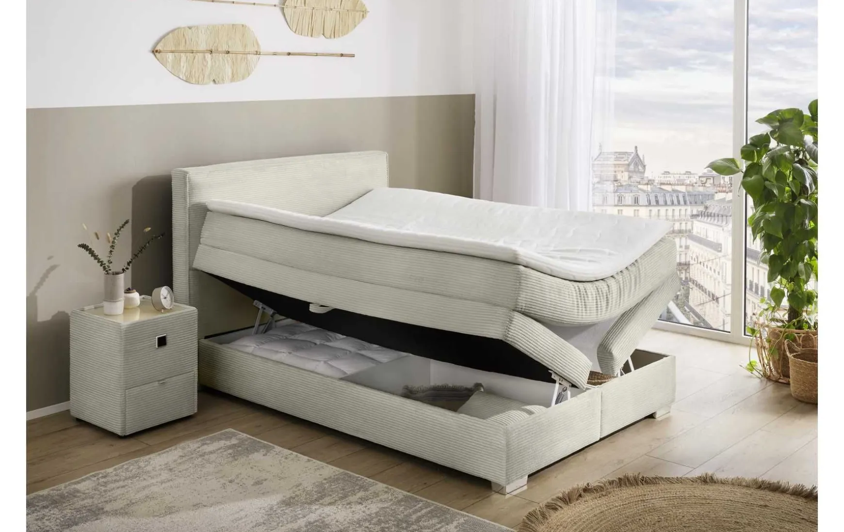 Das Boxspringbett überzeugt durch stilvolles Design und hohen Schlafkomfort. Mit seinem Bezug in angesagter Cord-Optik und der Farbgebung in Beige und Grau fügt es sich harmonisch in verschiedenste Einrichtungsstile ein. Die komfortable Box mit Bonell-Federkern-Polsterung bildet zusammen mit der Federkernmatratze in den Härtegraden H2 und H3 sowie dem PU-Schaum-Topper ein perfekt abgestimmtes Schlafsystem – für ein entspanntes und erholsames Liegegefühl. Die integrierte Liegefläche von ca. 140 x 200 cm bietet ausreichend Platz, während der praktische Bettkasten zusätzlichen Stauraum für Decken, Kissen oder Bettwäsche schafft. Mit Maßen von 154 cm Breite, 116 cm Höhe und 217 cm Tiefe verbindet das Bett durchdachte Funktionalität mit modernem Komfort. Der Bezug aus pflegeleichter Kunstfaser rundet das Gesamtpaket ab.