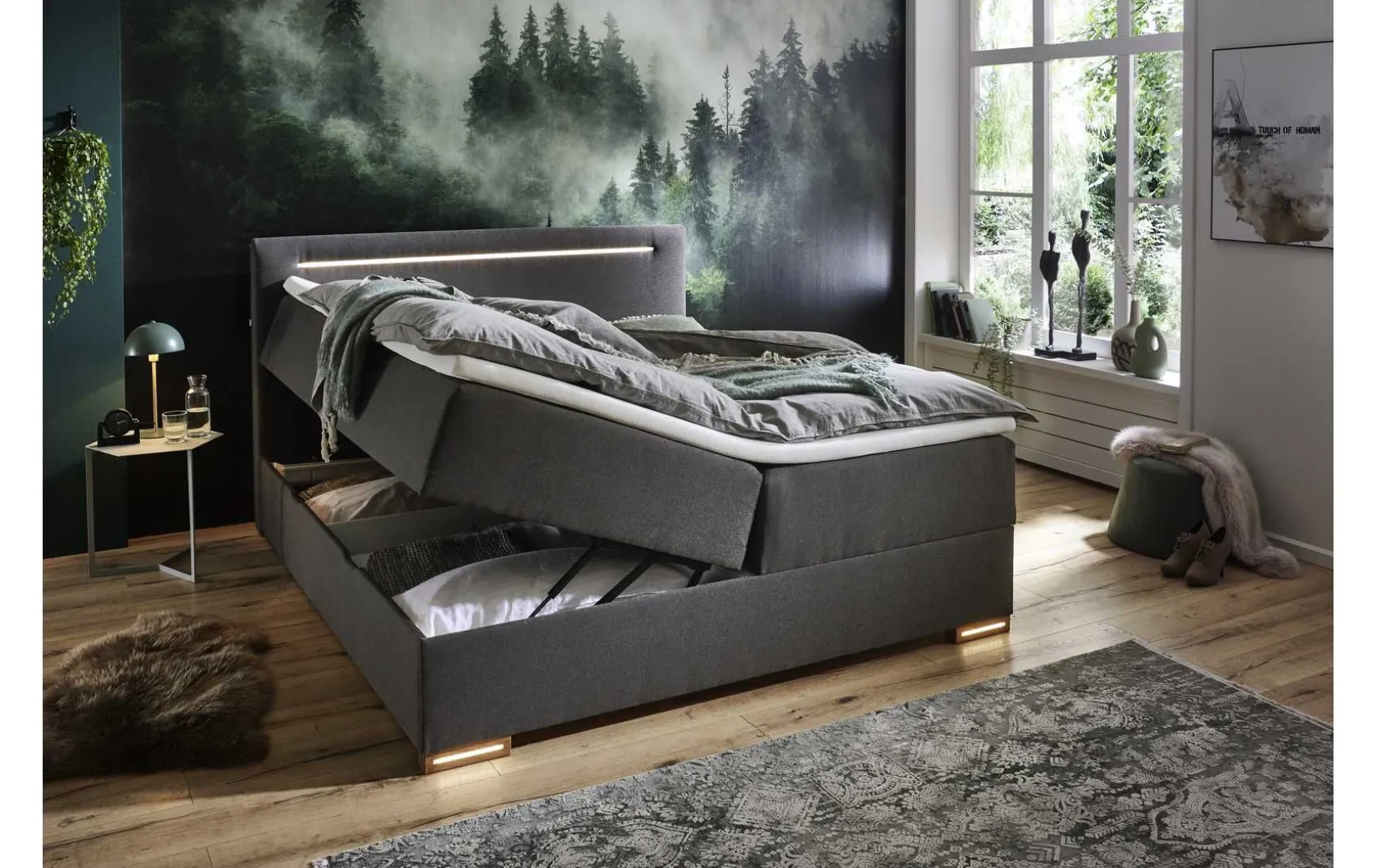 Boxspringbett inkl. Bettkasten mit Bonnellfederkernbox und Bonnellfederkern Matratze, Inkl. PU Topper ca. 4 cm Hoch, Füße 6 cm hoch, Box und Matratze 28 cm hoch, Bettkasten frontal klappbar Höhe: ca. 25 cm, LED Beleuchtung im Bettkopfteil und in den Füßen in Blau, Schaltbar am Bettkopfteil, inkl. USB-Anschluss Bettstellmaß:LxBxH 208,5x123x110 cm