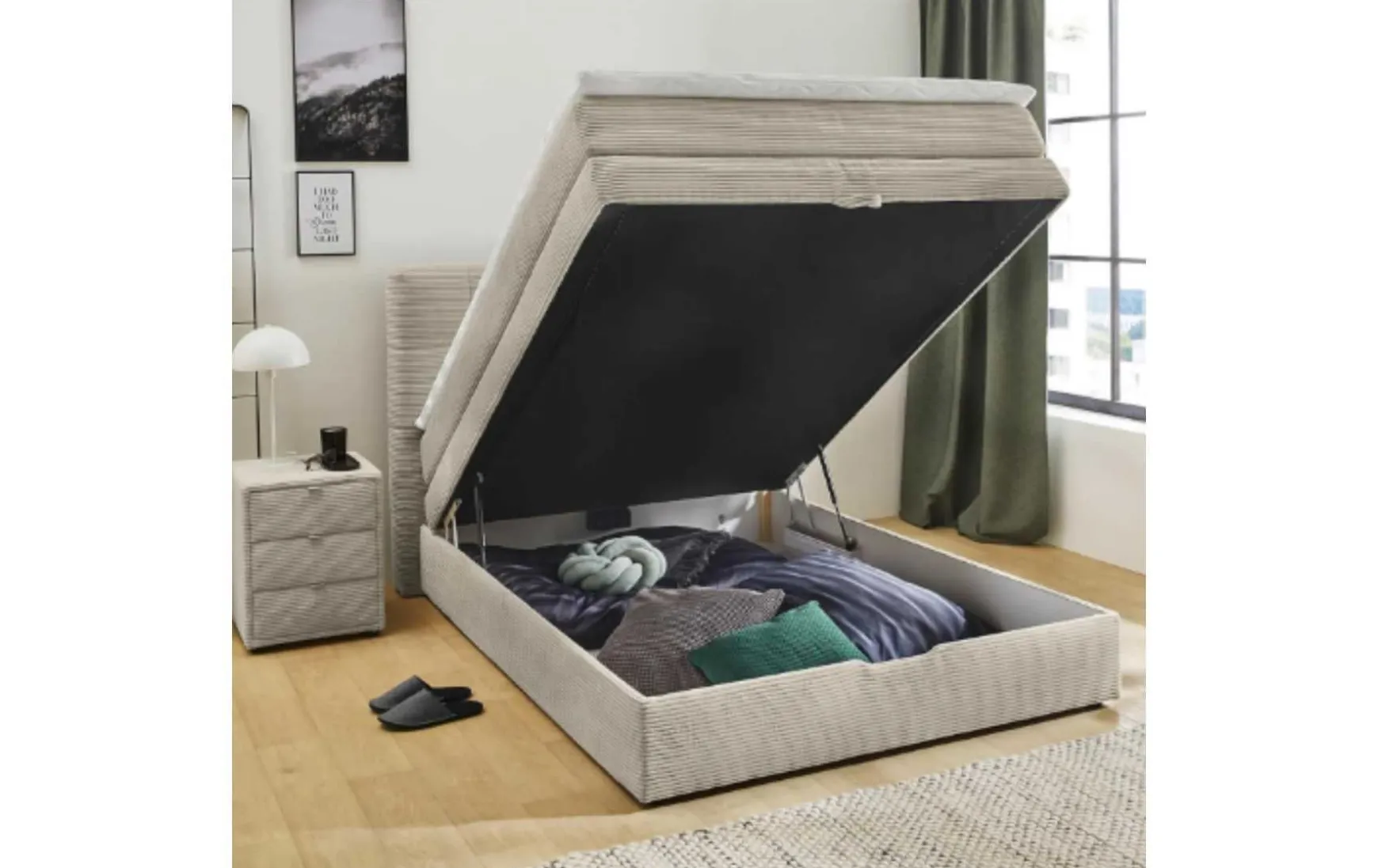 Das Boxspringbett in Beige (Light Greige) bietet hohen Schlafkomfort mit 7-Zonen-Tonnentaschenfederkern, Härtegrad H3 und komfortabler Liegehöhe von ca. 66 cm. Der große Stauraum mit Gasdruckfeder sorgt für praktische Aufbewahrung, während der inklusive Kaltschaum-Topper mit bei 60 °C waschbarem Bezug für optimale Hygiene sorgt. Bezogen mit modernem Cordstoff aus 100 % Polyester und ausgestattet mit schwarzen Füßen überzeugt das Bett durch Funktionalität und zeitloses Design.