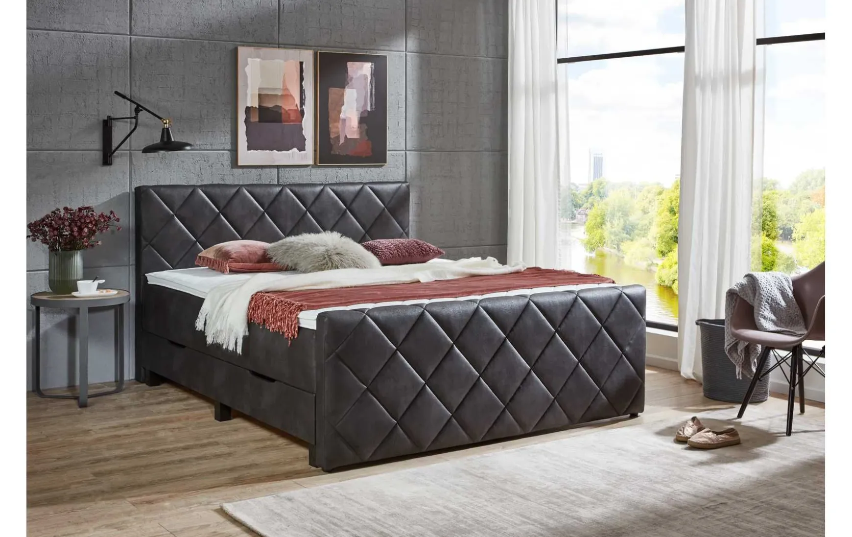 Dieses hochwertige Boxspringbett begeistert nicht nur mit seinem hervorragenden Liegekomfort, sondern auch mit seinem aufwändigen Design. Die rautenförmige Steppung auf dem robusten Kunstlederbezug unterstreicht die Geradlinigkeit dieses Bettes. Ein Schlafplatz, der sich wunderbar zu verschiedensten Einrichtungsstilen kombinieren lässt. Mit einem grauen Stoffbezug in Microfaser und einer optisch ansprechenden Rautensteppung am Kopf- und Fußteil fügt sich das Bett klassisch und doch modern in Ihr Schlafzimmer ein und verspricht dabei höchsten Liegekomfort. Innerhalb des Basisgestells befindet sich ein doppelter Bonell-Federkern, bestehend aus Bonell und Mini-Bonell im unteren, mittleren Bereich. Dieser raffinierte Aufbau sorgt für eine optimale Körperanpassung, welche durch den Komfortschaum-Topper ideal unterstützt wird. Neben dem gemütlichen Topper und der Doppelfederkern-Polsterung ist das Bett zudem mit einem Bettkasten ausgestattet, welcher reichlich Stauraum für Decken und Kissen bietet. Überzeugen auch Sie sich von dem einzigartigen und unvergesslichen Komfort des Boxspringbetts und genießen Sie erholsame Nächte auf einer Liegefläche von 180×200 cm.
