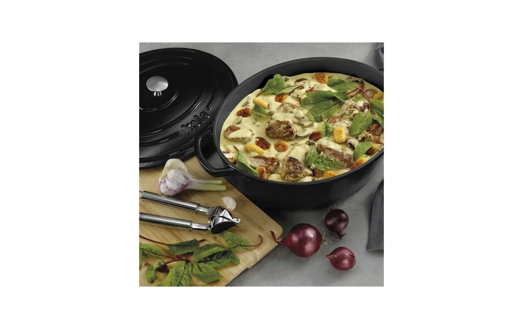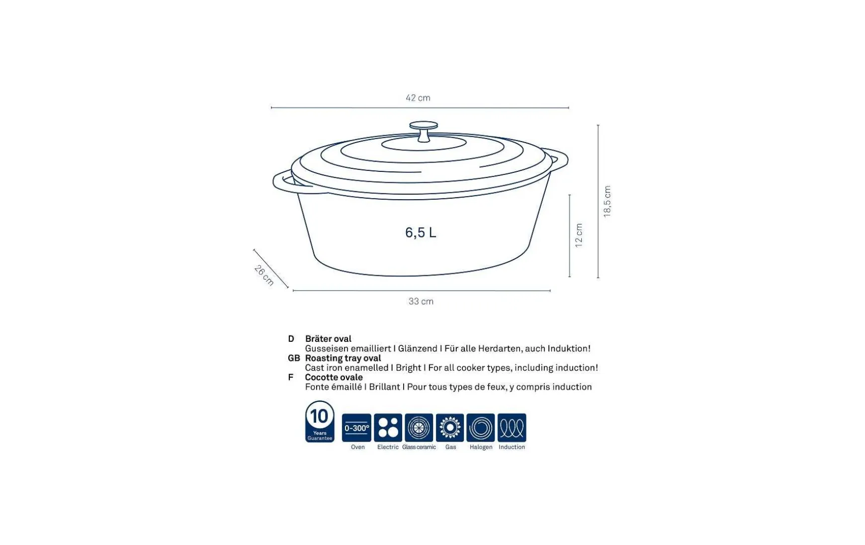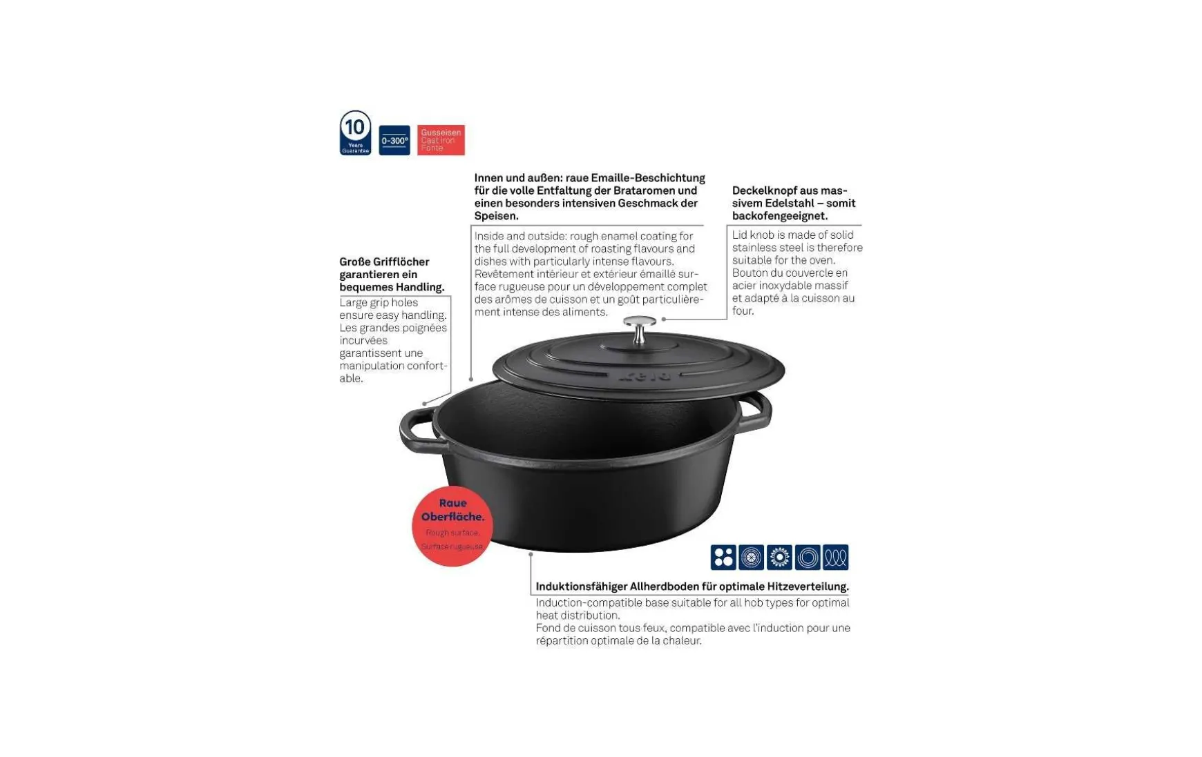Besonderes Design und besondere Eigenschaften – mit diesem Bräter wird nicht nur die Küchenausstattung zum Hingucker sondern auch die Koch- und Bratergebnisse. Der ovale Bräter zeichnet sich aus durch eine Emaille-Beschichtung sowohl innen als auch außen. Bis 300° C verwendbar. Bräter kann stark erhitzt werden. Innenraum wird gleichmäßig erhitzt. Gusseisenbräter mit Deckel in Schwarz, mit matter Optik. Gesamtlänge inklusive Griffe 42 cm.