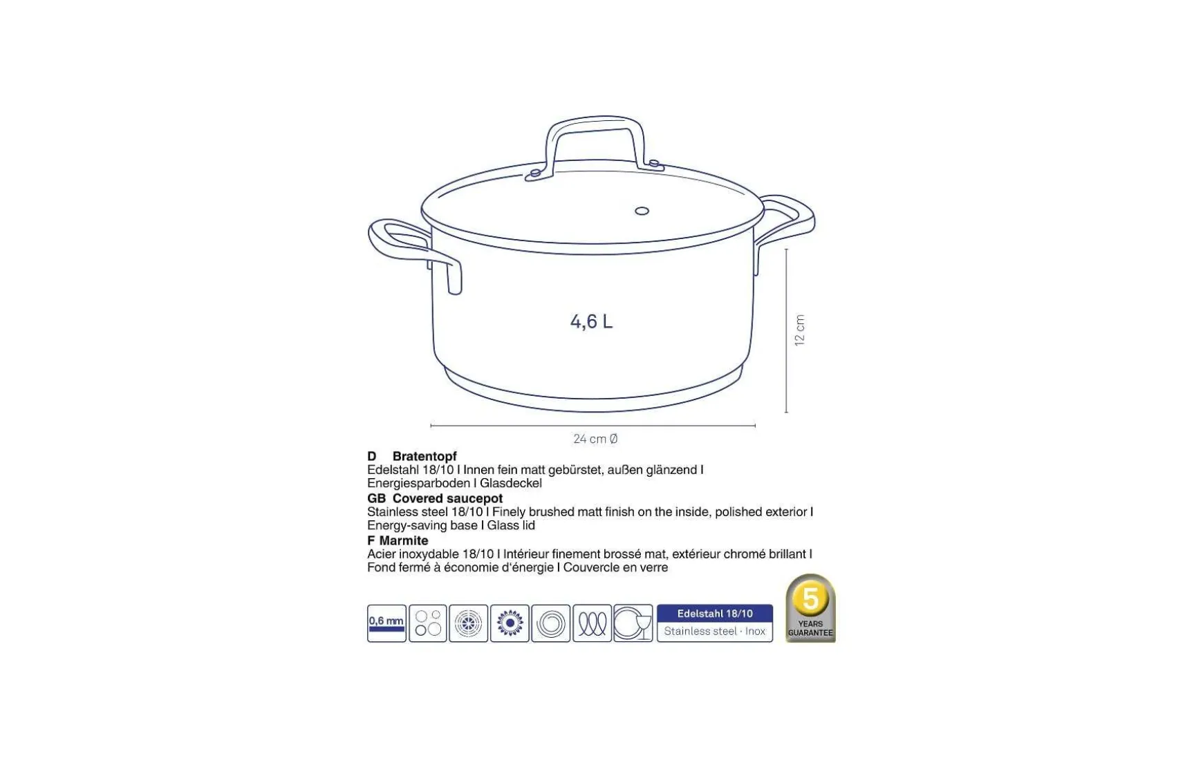 Dieser Bratentopf eignet sich ideal zum Anbraten, Garen und Schmoren von Fleisch, besteht aus 18/10 Edelstahl und hat einen Glasdeckel mit Edelstahlgriff. Schon auf den ersten Blick erkennt man die hochwertige Verarbeitung. Außen ist der Bratentopf glänzend und innen fein, matt gebürstet. Dieser Topf hat einen Allherdboden und eignen sich für Gas, Glaskeramik, E-Herd und Induktionsherd. Topfgriffe und Deckelgriff bestehen aus Edelstahlguss. Der Glasdeckel besitzt ein Auslassventil für Dampf. Es gibt eine praktische Innenskalierung mit welcher Sie leicht das aktuelle Füllvolumen ablesen können. Hochwertige Verarbeitung mit einem aufwendig gefalteten Rand. Der Energiesparboden wurde durch eine sogenannte „Impact-Bonding-Technologie“ verarbeitet. Diese ermöglicht zudem eine perfekte Bodenhaftung, einen maximalen Widerstand gegenüber Temperaturschocks und eine optimale Wärmeverteilung. Nutzbar bis 220°C, mit Deckel bis 180°C.