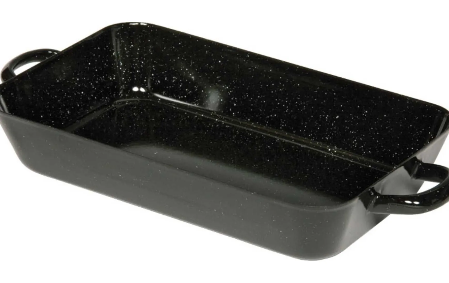Diese Bratrohrpfanne verfügt über einen Rand mit 5,2 cm Höhe. Sie eignet sich so besonders für die Zubereitung Braten, Quiche und flachen Kuchen, kurz fast alles, das im Backofen gebraten, gebacken oder geschmort werden will. Sie ist aus robuster schwarzer Emaille gefertigt. Der Rand ist rund geschwungen – Bördelrand in der Emaillesprache – dabei wird das Metall gebogen, um einen runden und stabilen Rand zu erzeugen. Die Pfanne wird meistens im Backrohr verwendet.