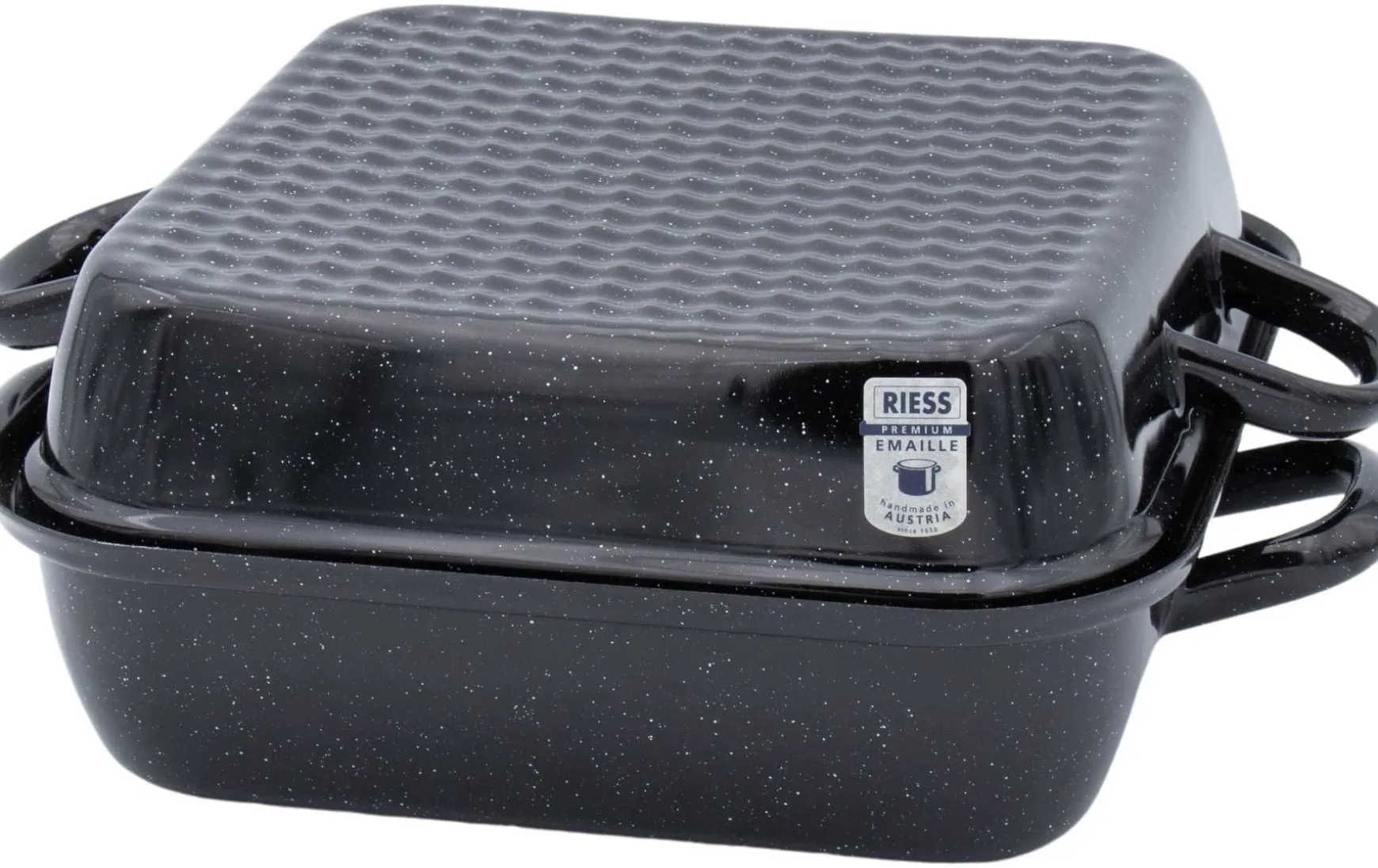 Unsere traditionelle Emaille Bratform mit ihren typischen zwei Tragegriffen und Deckel weckt bei Vielen die Erinnerung an Omas sonntäglichen Schweinsbraten aus dem „Bratenreindl“ (österreichischer Begriff für Kochgeschirr). Mit dieser Bratform mit Deckel haben sie einen ideale Bräter mit dem man Fleisch stundenlang schmoren kann. Der Deckel schließt perfekt dank des Falzes im unteren Bräterteil und ist ebenso mit zwei Griffen ausgestattet. Es wird wärmstens empfohlen beim Abnehmen einen Topflappen zu verwenden. In der Form kann der Braten dann gleich problemlos geschnitten werden. Nach dem Mahl ist der Bräter aus Emaille einfach zu reinigen. Die Emaille bewahrt die Aromen und der Deckel lässt die Flüssigkeit nicht entweichen. Und das Beste – man hat mit diesem Stück mit einem Schlag auch zwei Backforme: Benötigt man den Deckel einmal nicht, kommt der Bräterdeckel selbst als zusätzliche Back-und Bratform zum Einsatz.