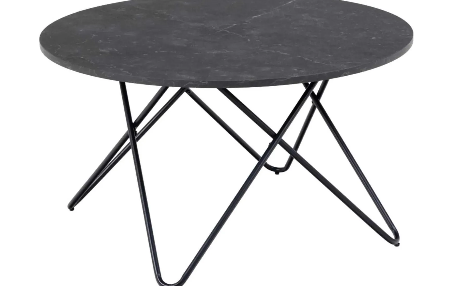 Dieser Couchtisch besteht aus einer Mischung zeitgenössischer Raffinesse und modernem Charme der Mitte des Jahrhunderts. Die runde, mit schwarzer Marmoroptik verzierte Tischplatte bietet eine stilvolle Ablagefläche für kleine Dekorationen und ruht auf einem schwarzen, geometrischen Drahtgestell aus Stahl, das für einen verspielten Twist sorgt.