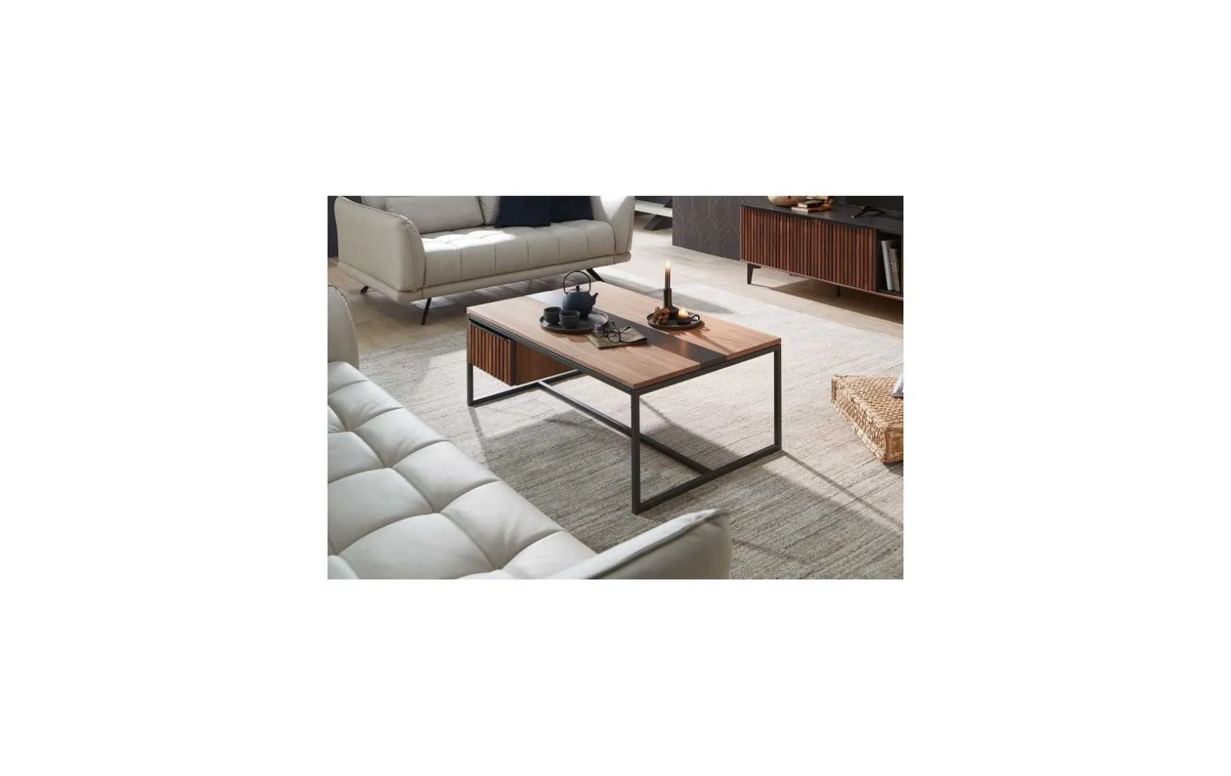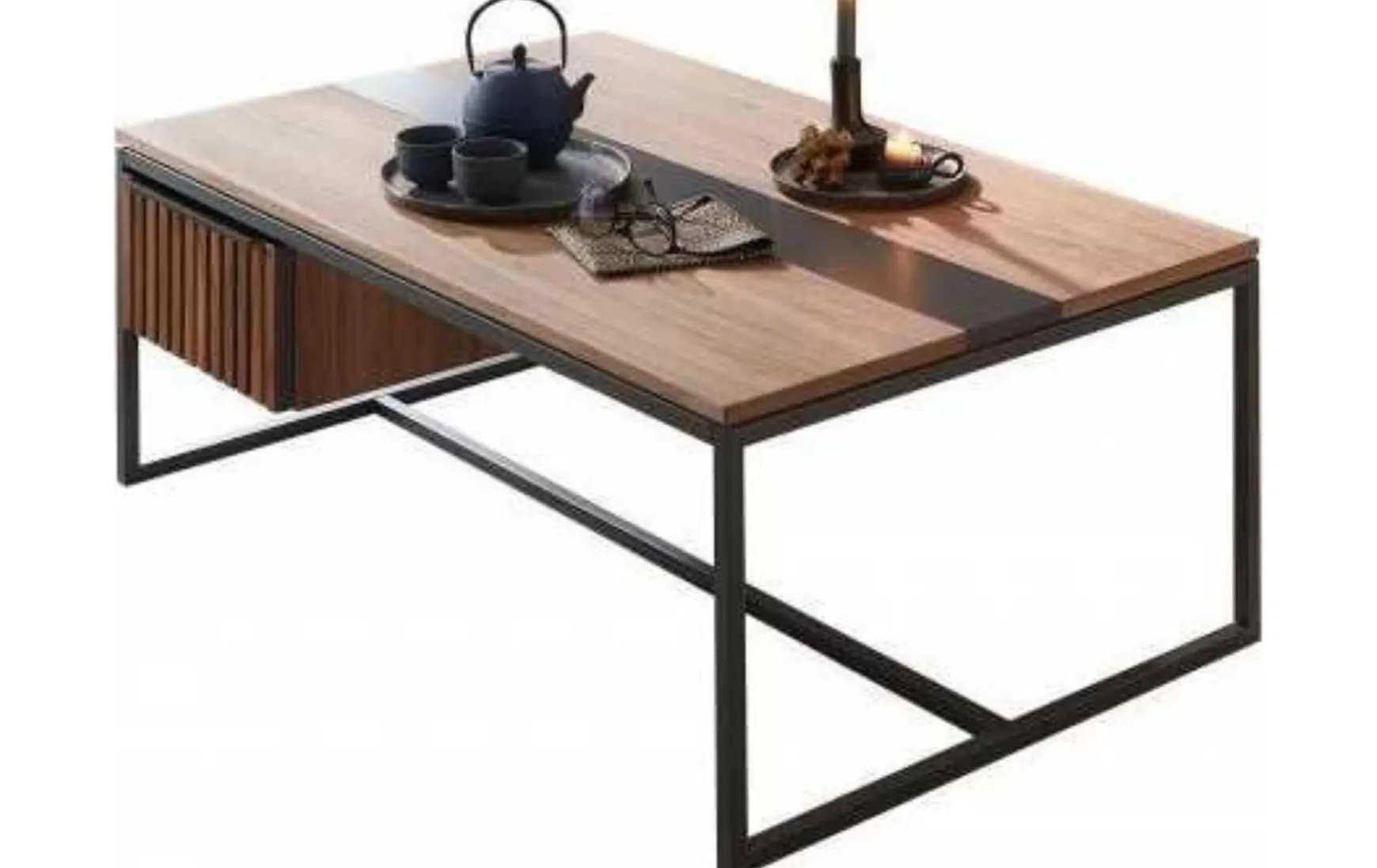 Dieser Couchtisch aus massivem Nussbaumholz verbindet zeitlose Eleganz mit moderner Funktionalität. Die warme Holzoptik harmoniert perfekt mit dem schwarzen Metallgestell und macht den Tisch zu einem stilvollen Mittelpunkt im Wohnzimmer. Die integrierte Schublade bietet praktischen Stauraum für Alltagsgegenstände.