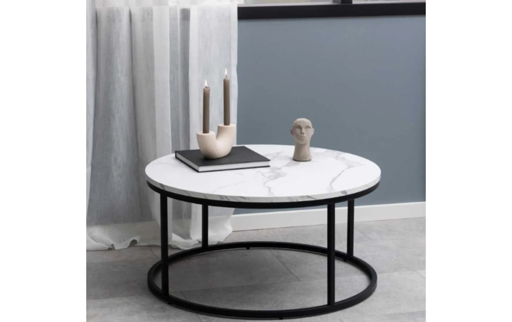 Der runde Couchtisch ist eine stilvolle und funktionelle Ergänzung für jedes Zuhause. Mit seiner Platte aus weißem Marmor Granada rauem Melamin bringt er einen Hauch von Eleganz und Raffinesse in Ihren Wohnbereich. Dieses langlebige Material ist nicht nur optisch ansprechend, sondern auch leicht zu reinigen und zu pflegen. Das Gestell des Couchtisches ist aus mattschwarzem, pulverbeschichtetem Stahl gefertigt, der für Stabilität und Festigkeit sorgt. Die Größe von Ø80×40 cm ist perfekt für kleinere Wohnzimmer oder als Akzent in größeren Räumen. Sein kompaktes Design ermöglicht eine einfache Platzierung in jedem Raum und macht ihn zu einer vielseitigen Möbelwahl.
