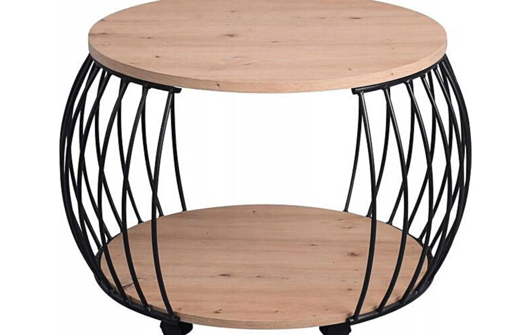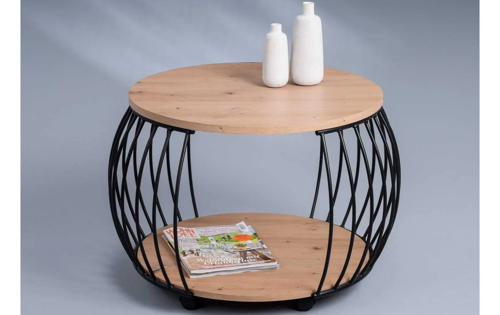 Die bauchige transparente Form in Kombination von schwarzem Metall und Artisaneiche-Dekor machen diesen durch Rollen mobilen Tisch zum gern gesehenen Element.